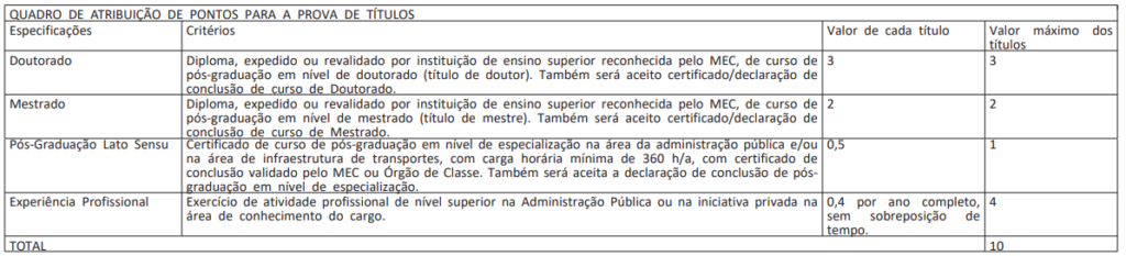 Confira na tabela abaixo os títulos que serão aceitos para a avaliação e sua respectiva pontuação: