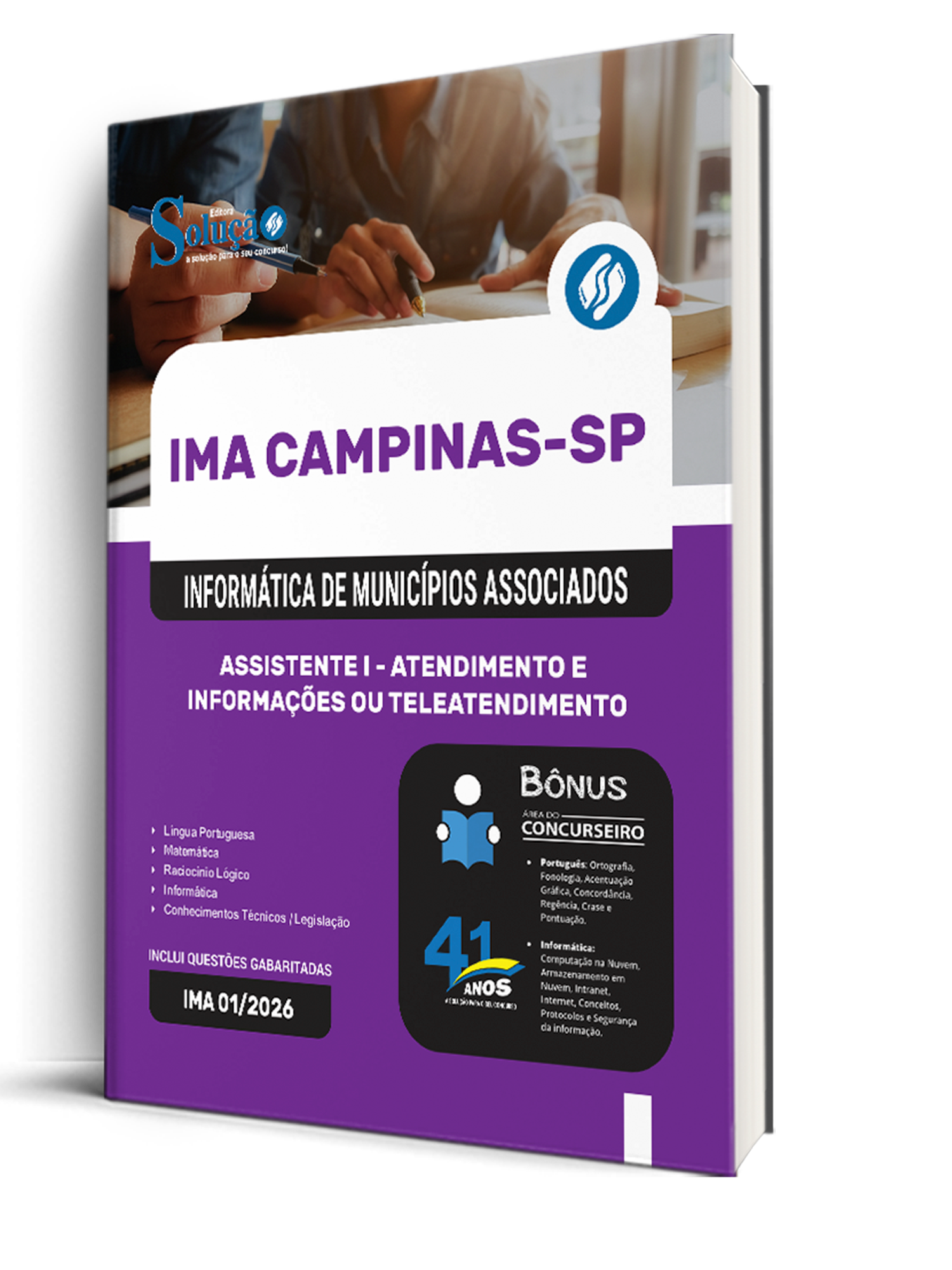 A Apostila IMA Campinas - Informática Municípios Associados 2026 - Assistente I - Atendimento e Informações ou Teleatendimento foi organizada para proporcionar um melhor rendimento na sua preparação, abordando cada conteúdo de forma objetiva e direcionada. Estude para o Concurso da IMA Campinas - Informática Municípios Associados 2026 com um material de acordo com o Edital oficial para o cargo de Assistente I - Atendimento e Informações ou Teleatendimento.