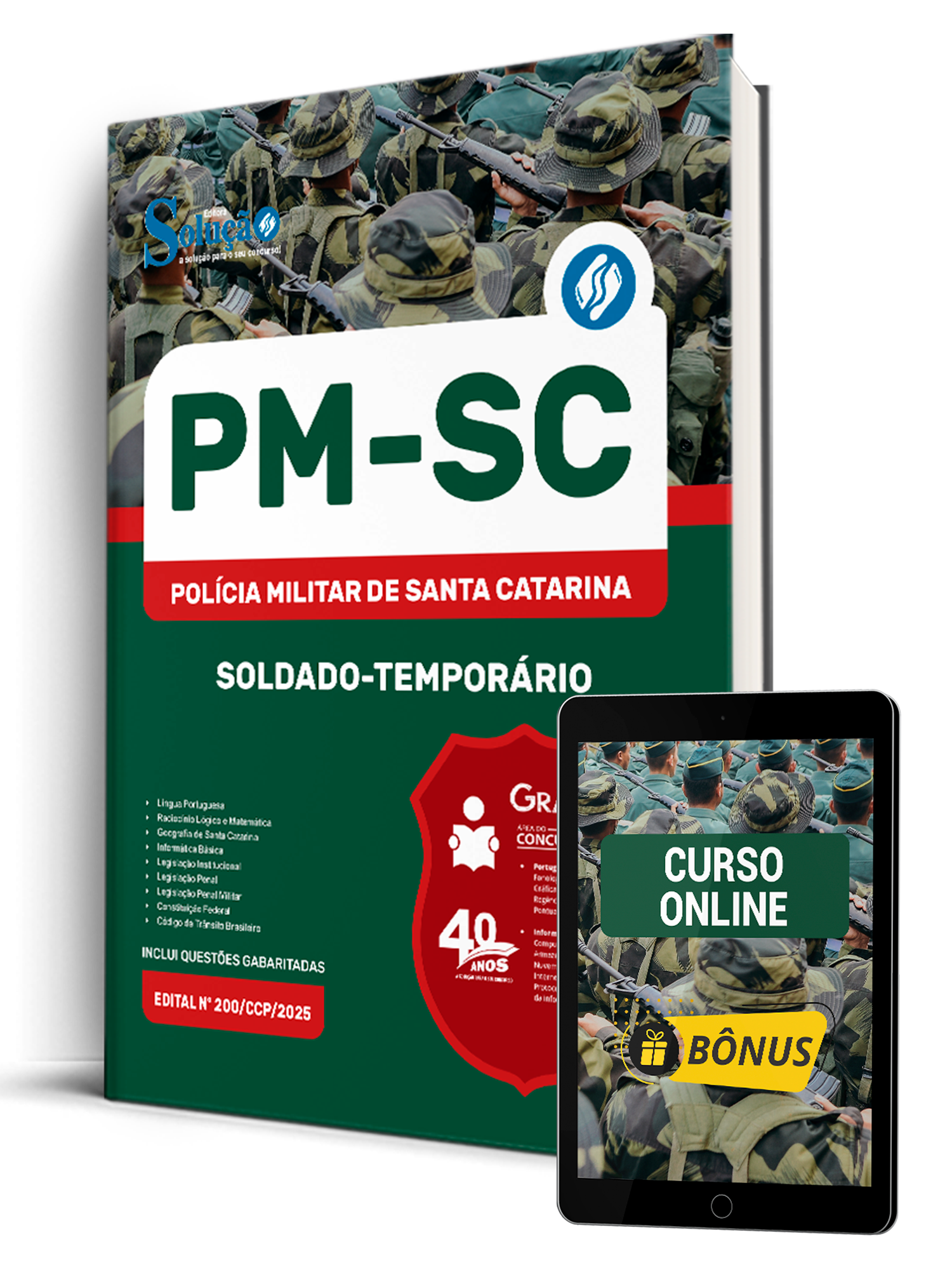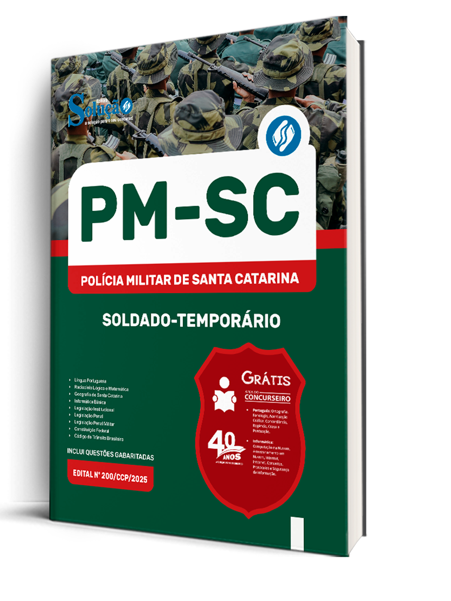 A Apostila Polícia Militar de Santa Catarina 2026 - Soldado - Temporário foi organizada para proporcionar um melhor rendimento na sua preparação, abordando cada conteúdo de forma objetiva e direcionada. Estude para o Concurso da Polícia Militar de Santa Catarina 2026 com um material de acordo com o Edital oficial para o cargo de Soldado - Temporário.