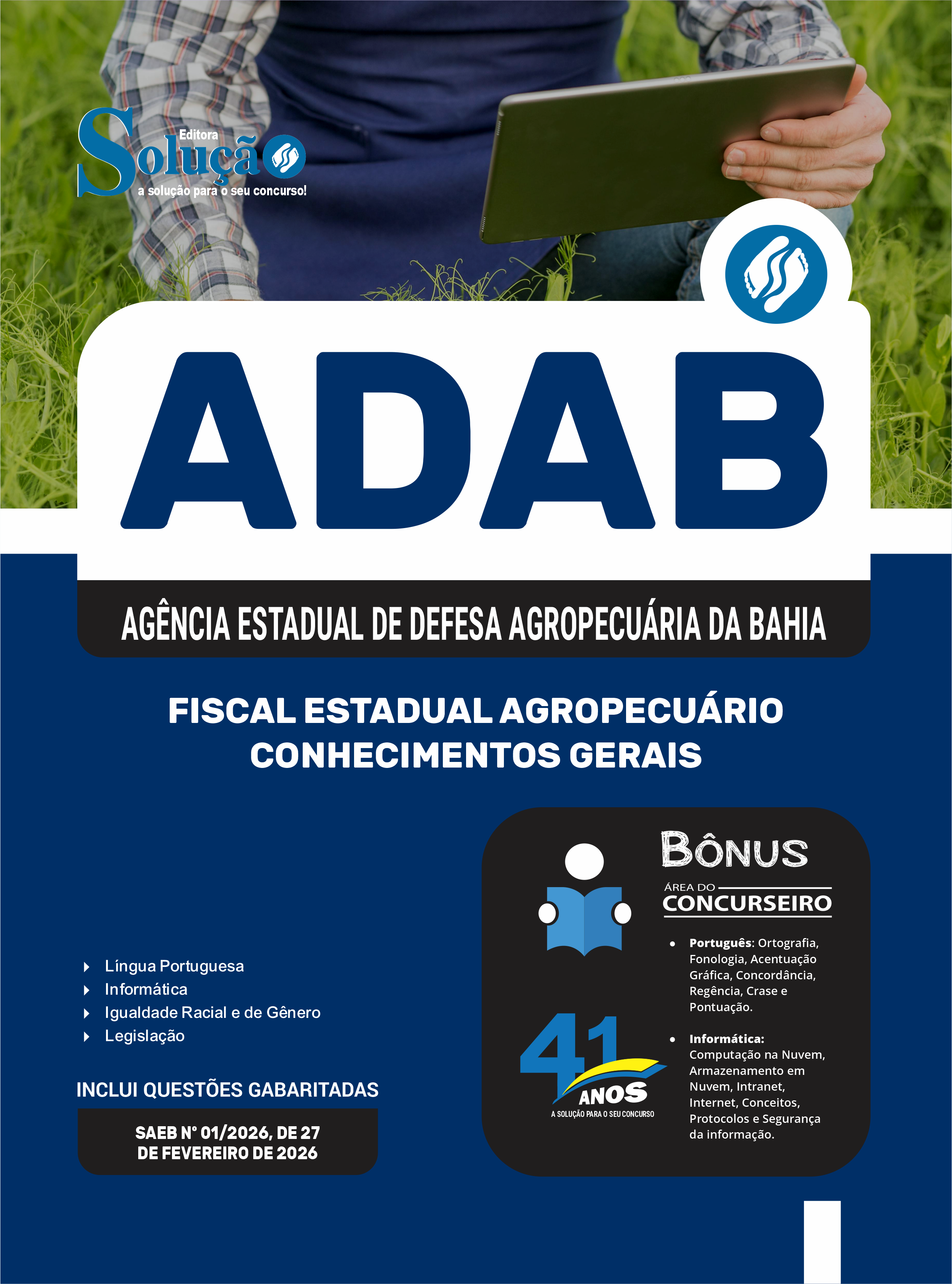 A Apostila Agência Estadual de Defesa Agropecuária da Bahia 2026 - Fiscal Estadual Agropecuário - Conhecimentos Gerais foi organizada para proporcionar um melhor rendimento na sua preparação, abordando cada conteúdo de forma objetiva e direcionada. Estude para o Concurso da Agência Estadual de Defesa Agropecuária da Bahia 2026 com um material de acordo com o Edital oficial para o cargo de Fiscal Estadual Agropecuário - Conhecimentos Gerais.