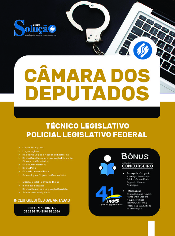 A Apostila Câmara dos Deputados 2026 - Técnico Legislativo – Policial Legislativo Federal foi organizada para proporcionar um melhor rendimento na sua preparação, abordando cada conteúdo de forma objetiva e direcionada. Estude para o Concurso da Câmara dos Deputados 2026 com um material de acordo com o Edital oficial para o cargo de Técnico Legislativo – Policial Legislativo Federal.