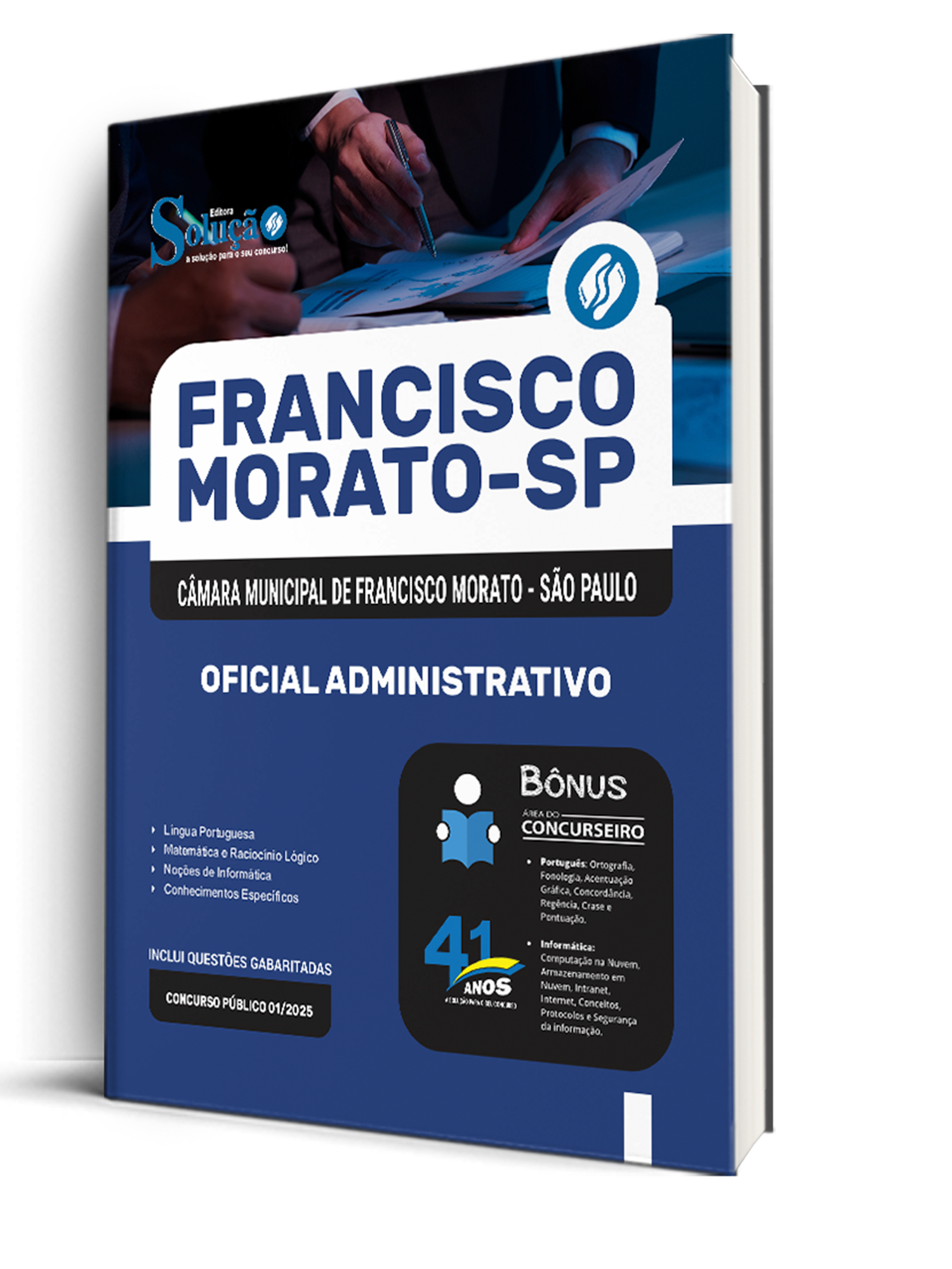 A Apostila Câmara Municipal de Francisco Morato - SP 2026 - Oficial Administrativo foi organizada para proporcionar um melhor rendimento na sua preparação, abordando cada conteúdo de forma objetiva e direcionada. Estude para o Concurso da Câmara Municipal de Francisco Morato - SP 2026 com um material de acordo com o Edital oficial para o cargo de Oficial Administrativo.