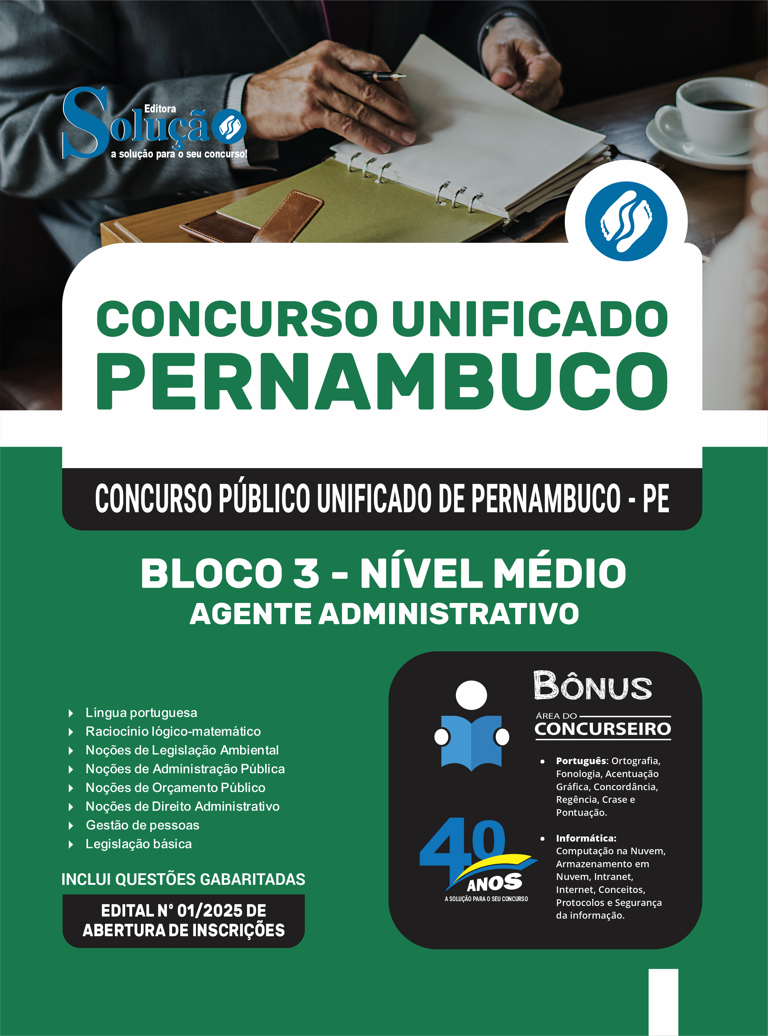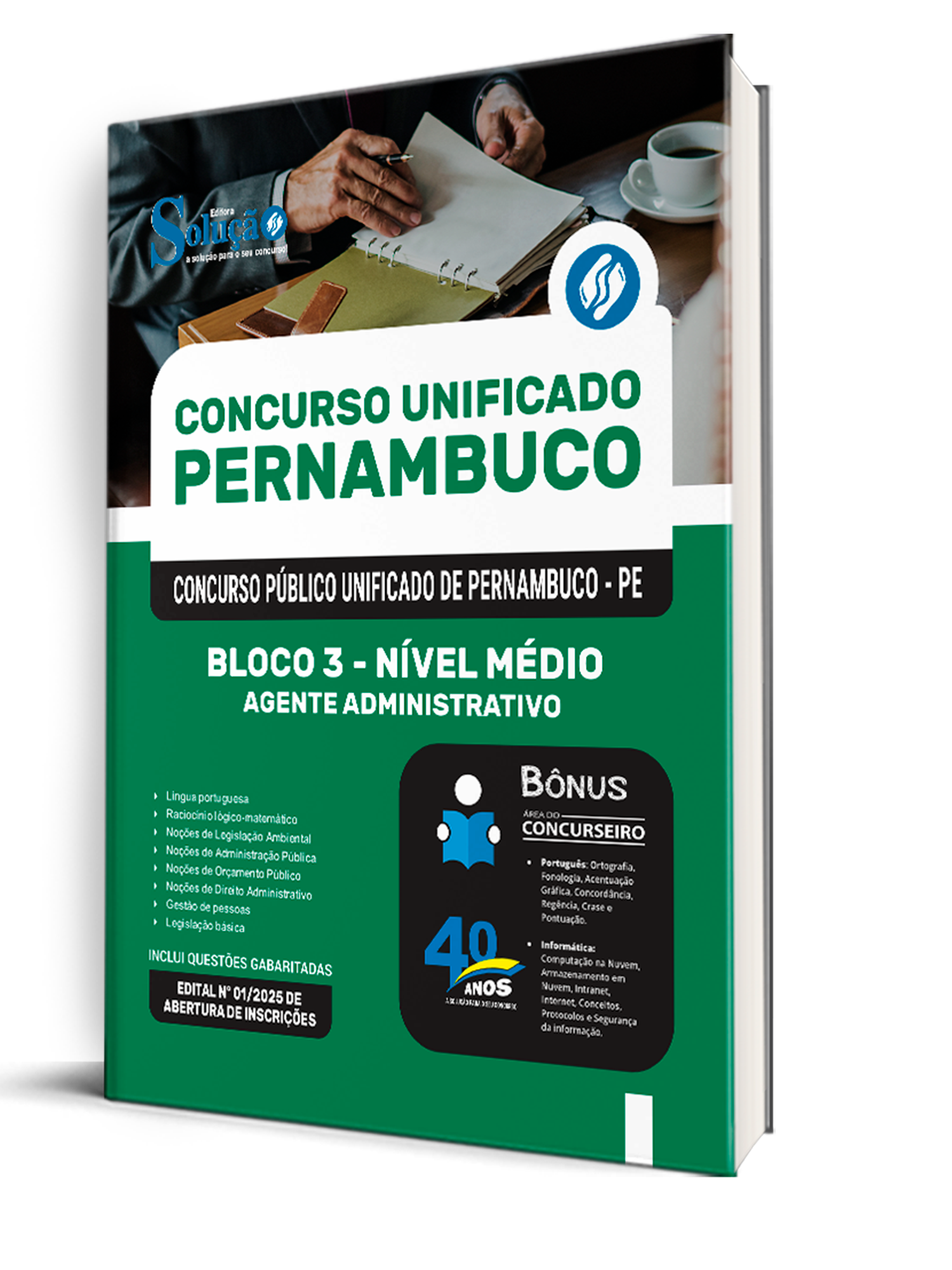 Apostila Concurso Unificado Pernambuco 2025 - Bloco 3 - Nível Médio - Agente Administrativo
