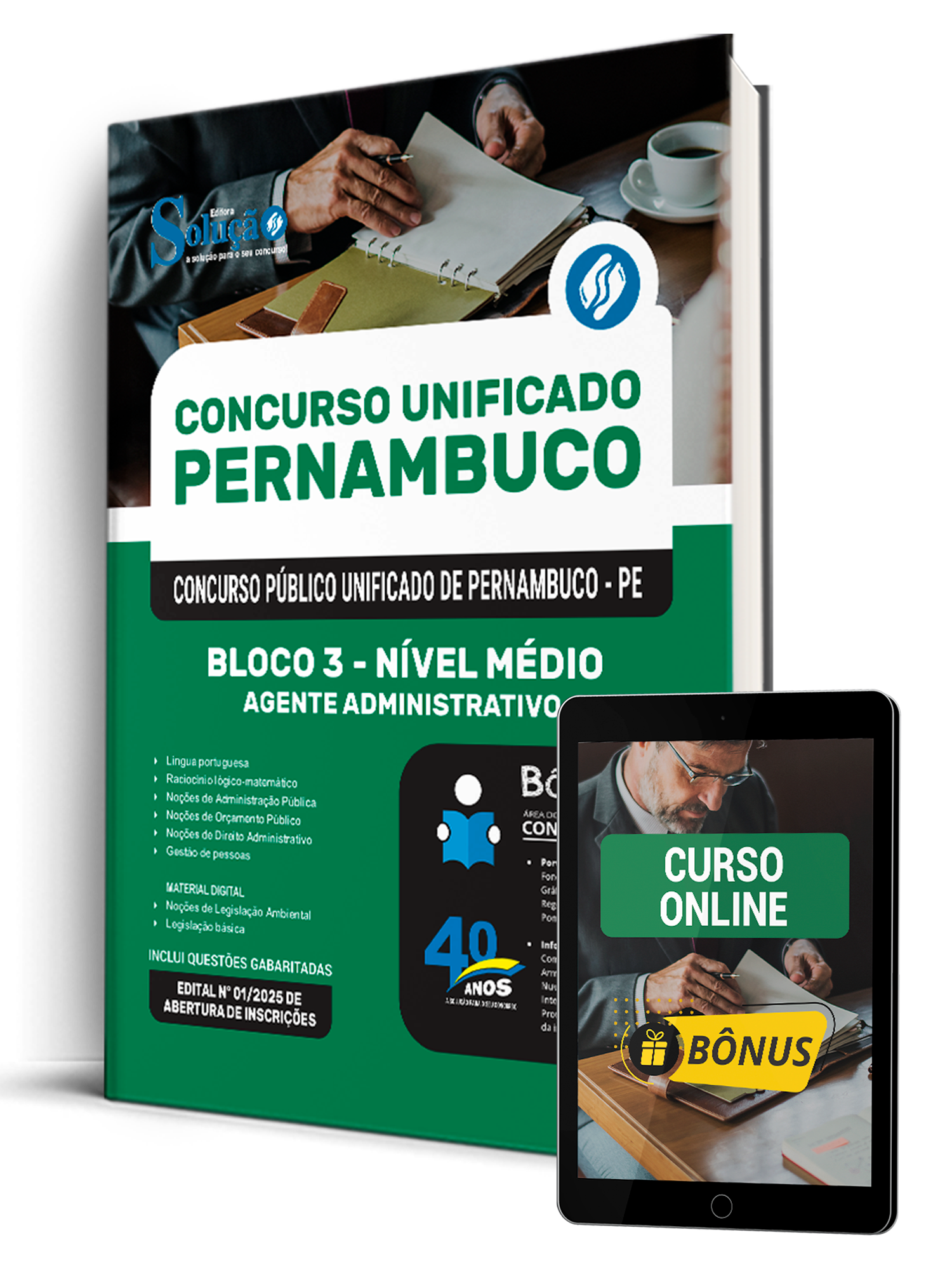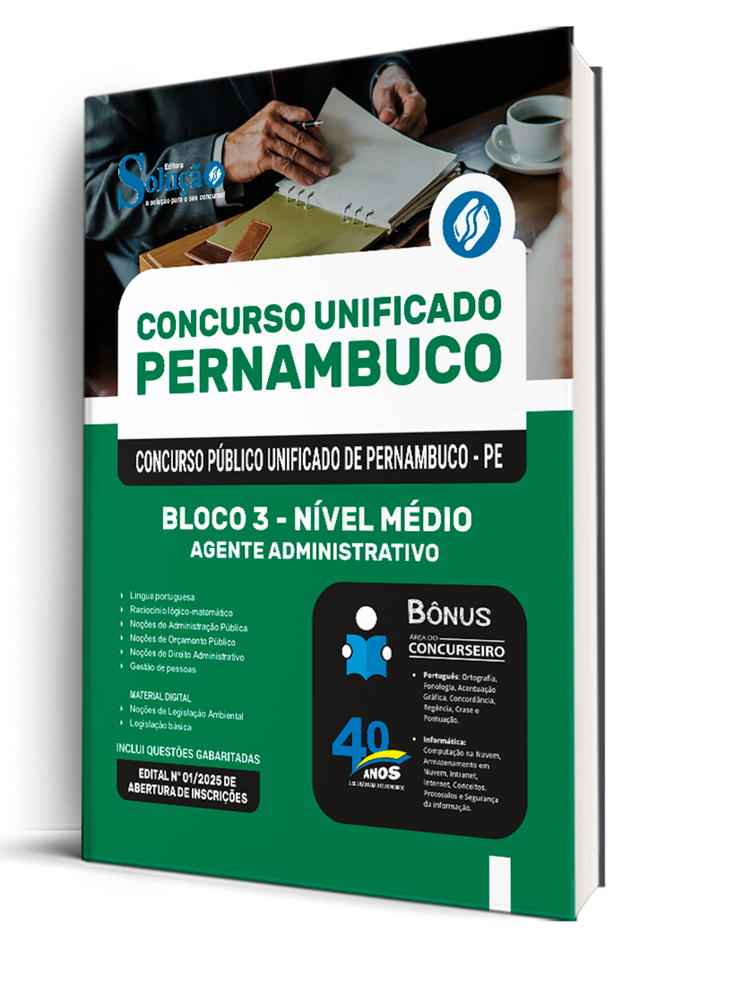 Apostila Concurso Unificado Pernambuco 2025 - Bloco 3 - Nível Médio - Agente Administrativo
