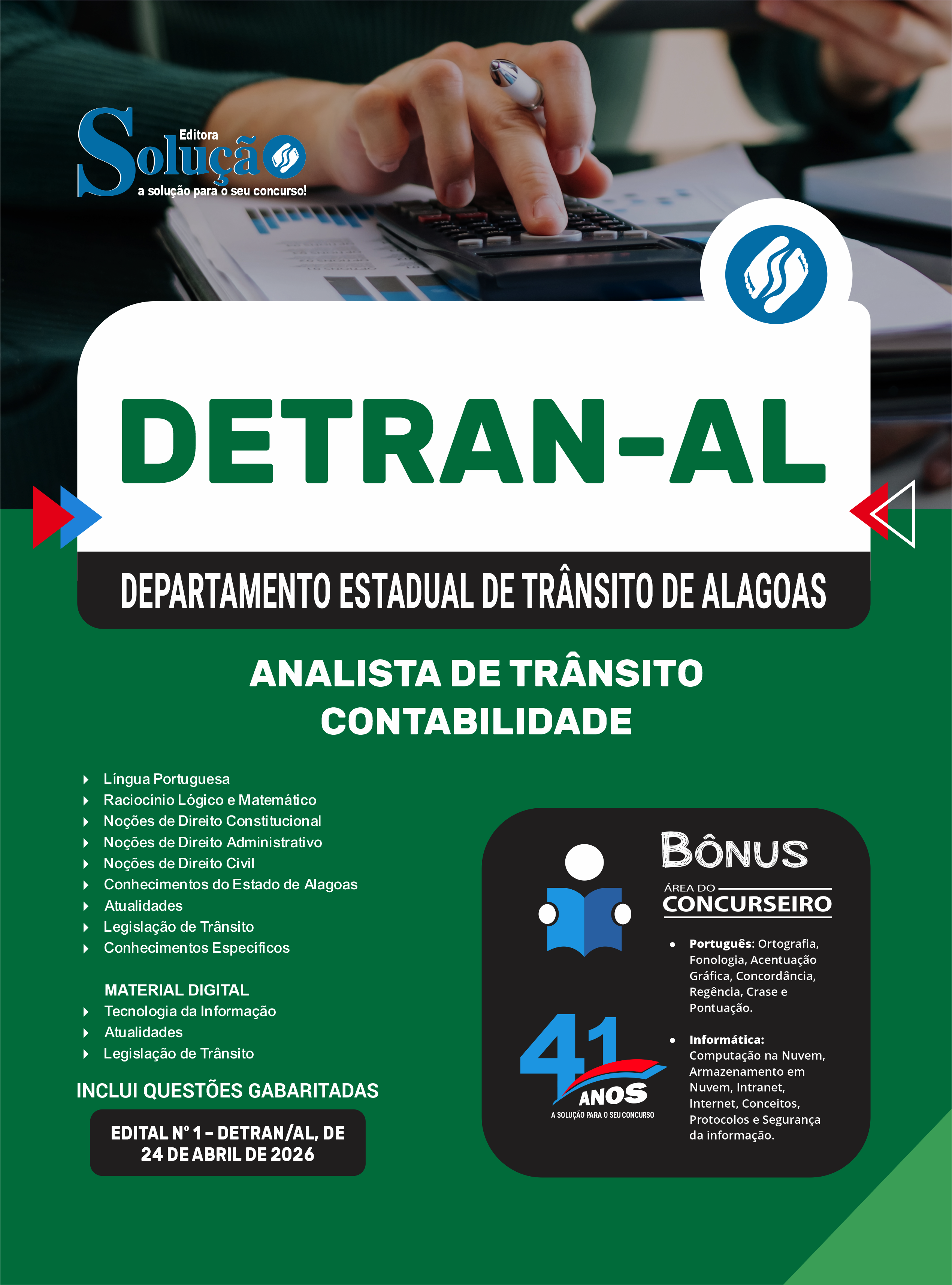 A Apostila Departamento Estadual de Trânsito de Alagoas 2026 - Analista de Trânsito - Contabilidade foi organizada para proporcionar um melhor rendimento na sua preparação, abordando cada conteúdo de forma objetiva e direcionada. Estude para o Concurso da Departamento Estadual de Trânsito de Alagoas 2026 com um material de acordo com o Edital oficial para o cargo de Analista de Trânsito - Contabilidade.