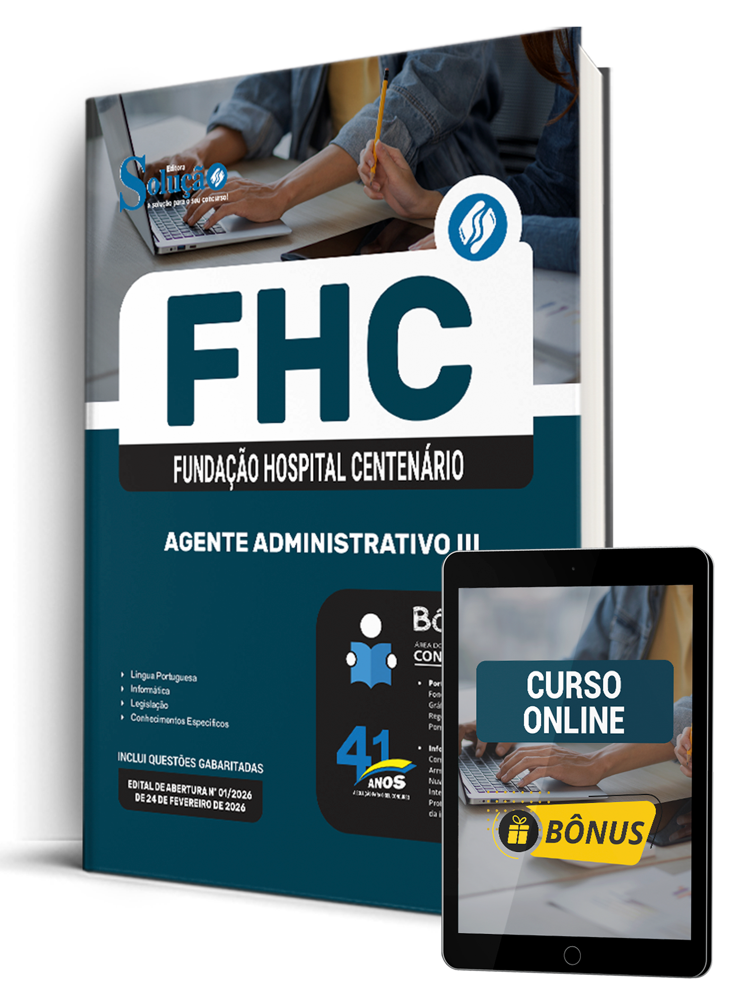 A Apostila Fundação Hospital Centenário 2026 - Agente Administrativo III foi organizada para proporcionar um melhor rendimento na sua preparação, abordando cada conteúdo de forma objetiva e direcionada. Estude para o Concurso da Fundação Hospital Centenário 2026 com um material de acordo com o Edital oficial para o cargo de Agente Administrativo III.