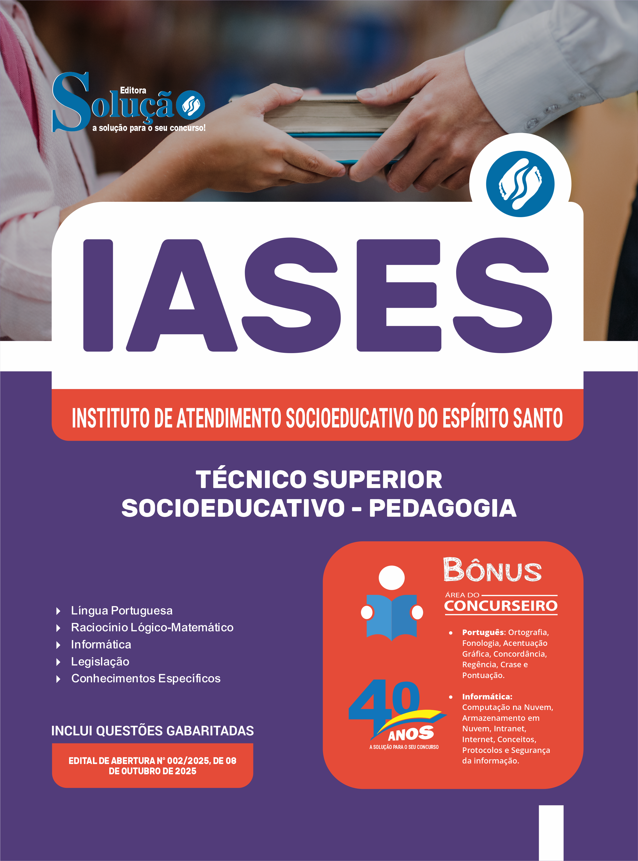 A Apostila Instituto de Atendimento Socioeducativo do Espírito Santo 2025 - Técnico Superior Socioeducativo - Pedagogia foi organizada para proporcionar um melhor rendimento na sua preparação, abordando cada conteúdo de forma objetiva e direcionada. Estude para o Concurso da Instituto de Atendimento Socioeducativo do Espírito Santo 2025 com um material de acordo com o Edital oficial para o cargo de Técnico Superior Socioeducativo - Pedagogia.