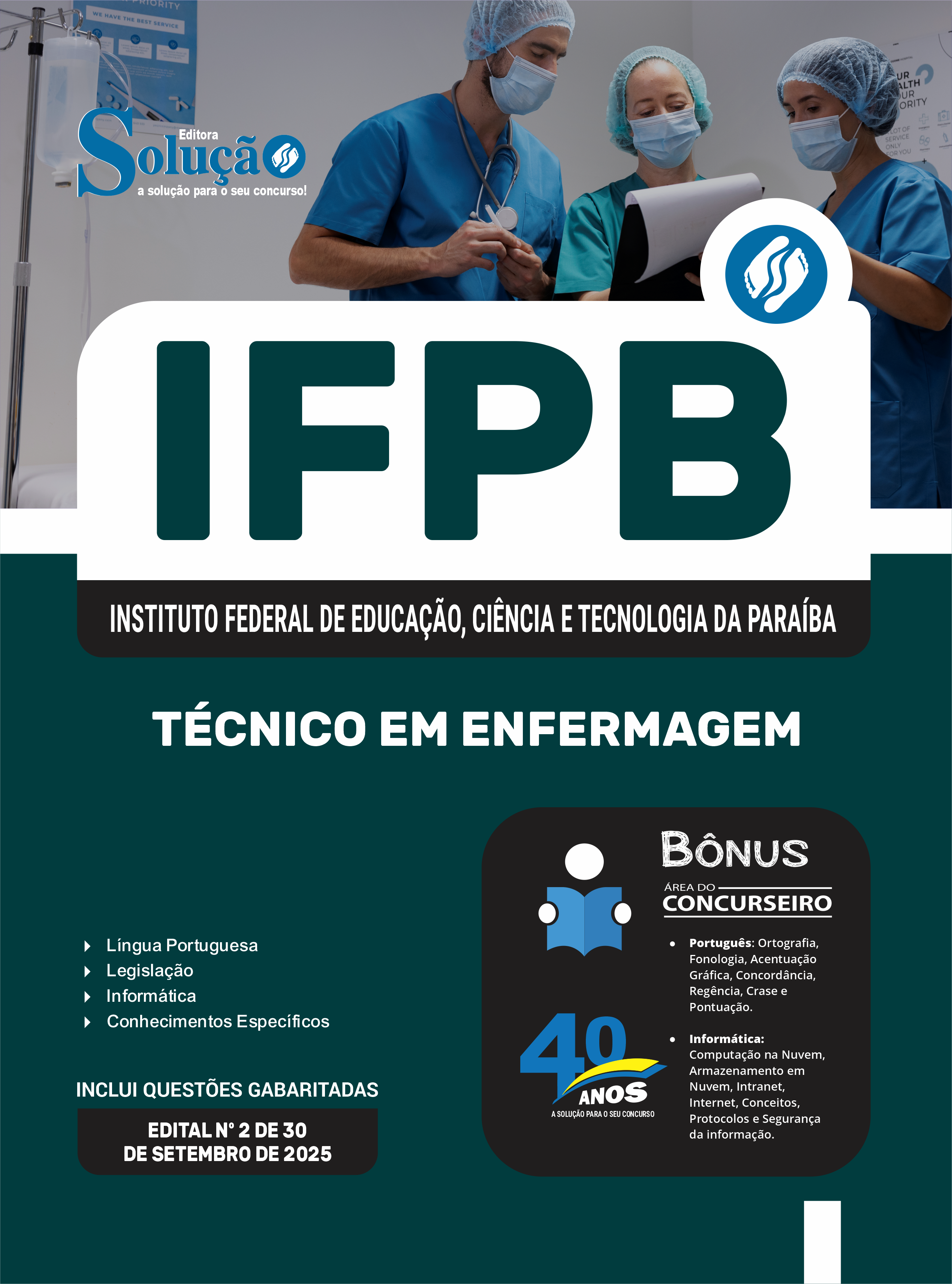 A Apostila Instituto Federal de Educação, Ciência e Tecnologia da Paraíba 2025 - Técnico em Enfermagem foi organizada para proporcionar um melhor rendimento na sua preparação, abordando cada conteúdo de forma objetiva e direcionada. Estude para o Concurso da Instituto Federal de Educação, Ciência e Tecnologia da Paraíba 2025 com um material de acordo com o Edital oficial para o cargo de Técnico em Enfermagem.
