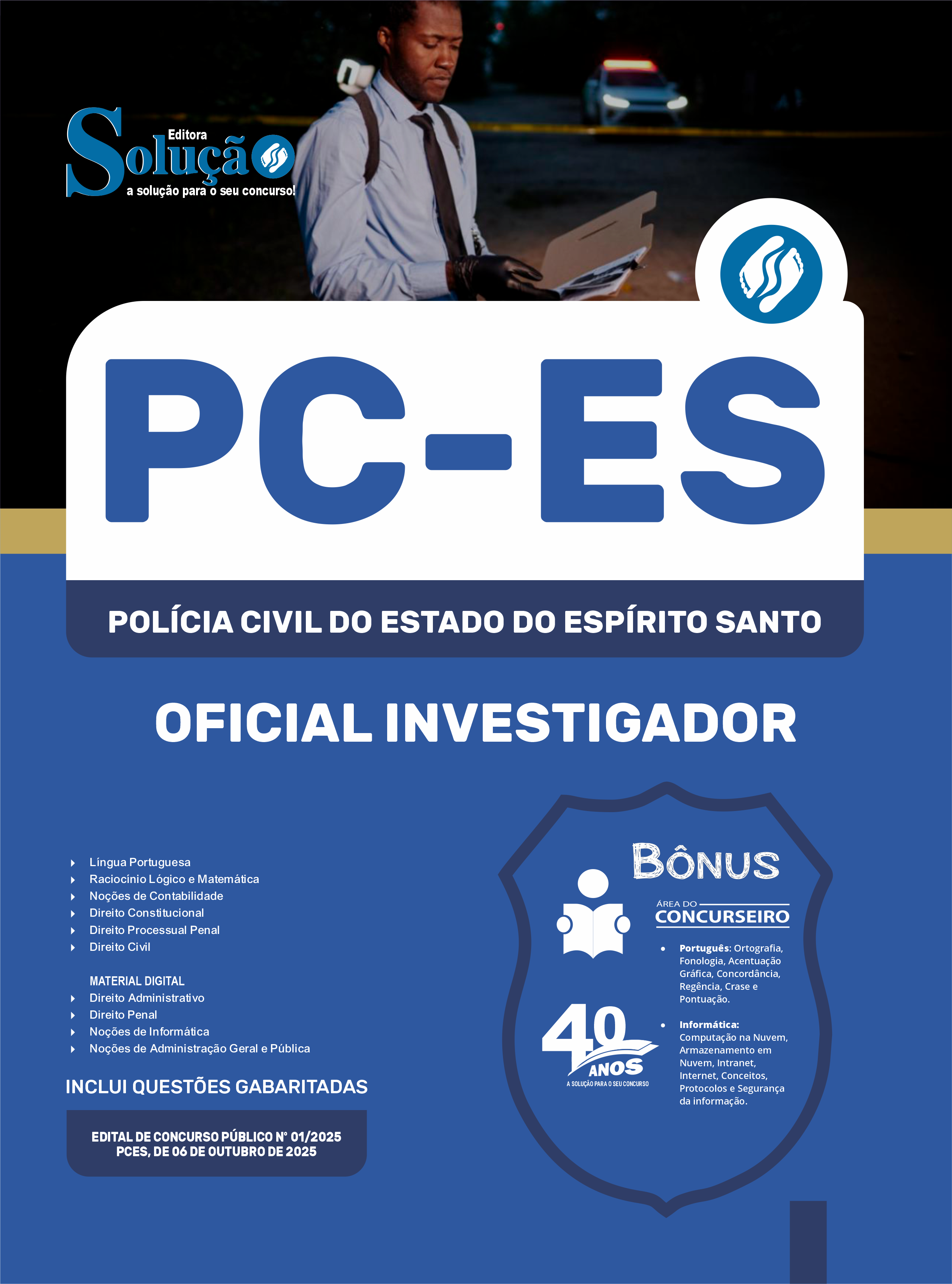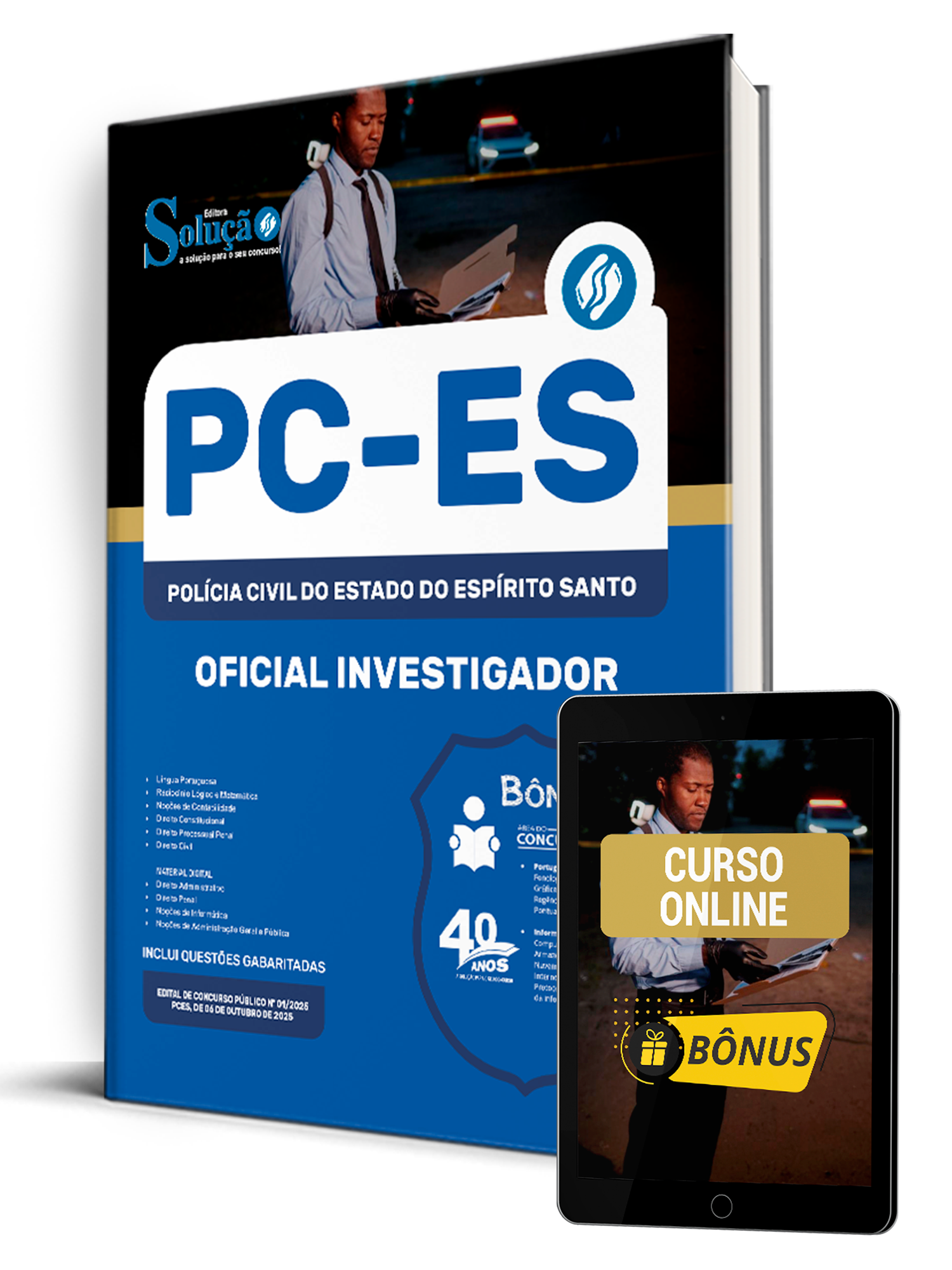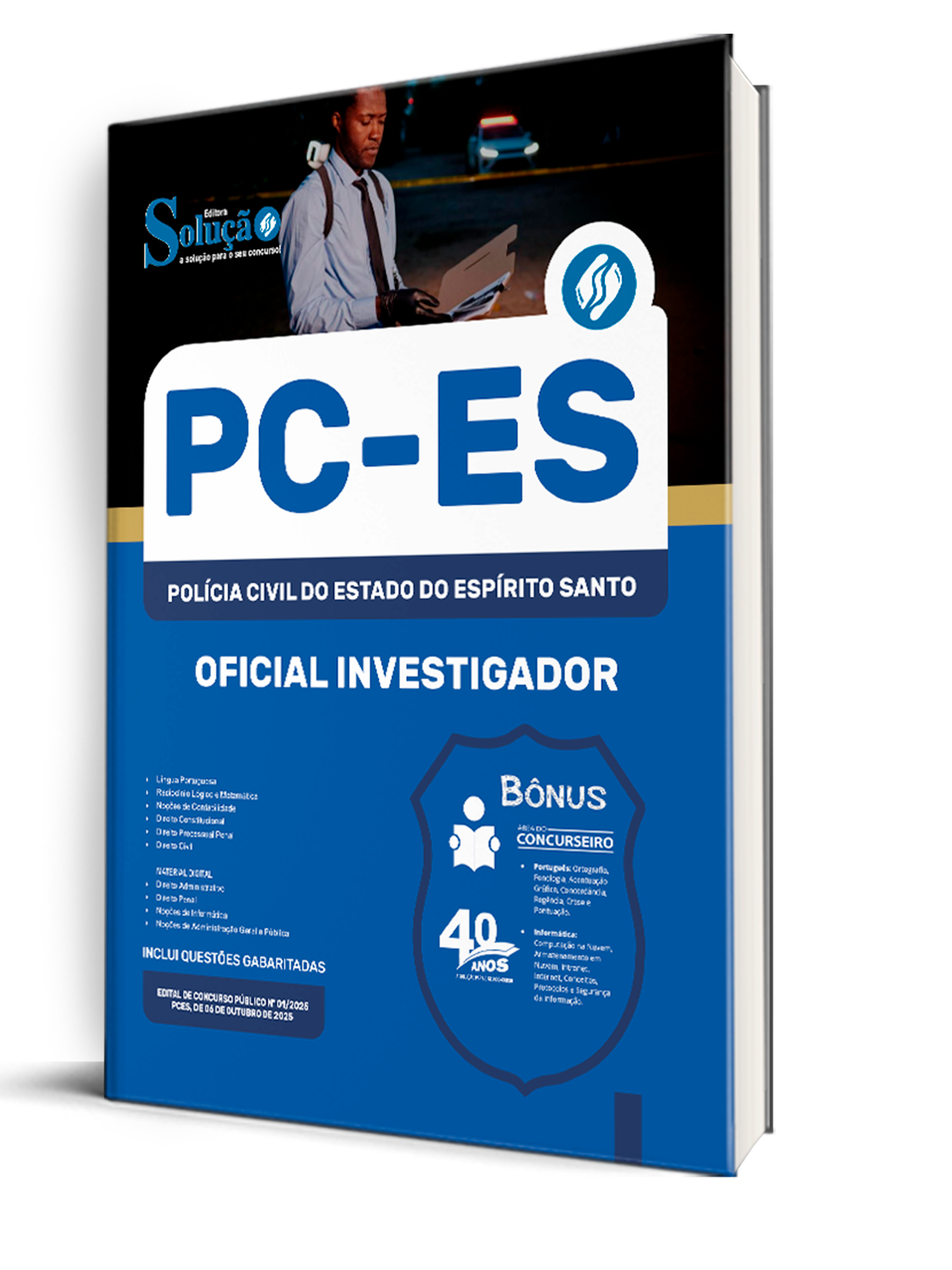 A Apostila Polícia Civil do Espírito Santo 2025 - Oficial Investigador de Polícia foi organizada para proporcionar um melhor rendimento na sua preparação, abordando cada conteúdo de forma objetiva e direcionada. Estude para o Concurso da Polícia Civil do Espírito Santo 2025 com um material de acordo com o Edital oficial para o cargo de Oficial Investigador de Polícia.