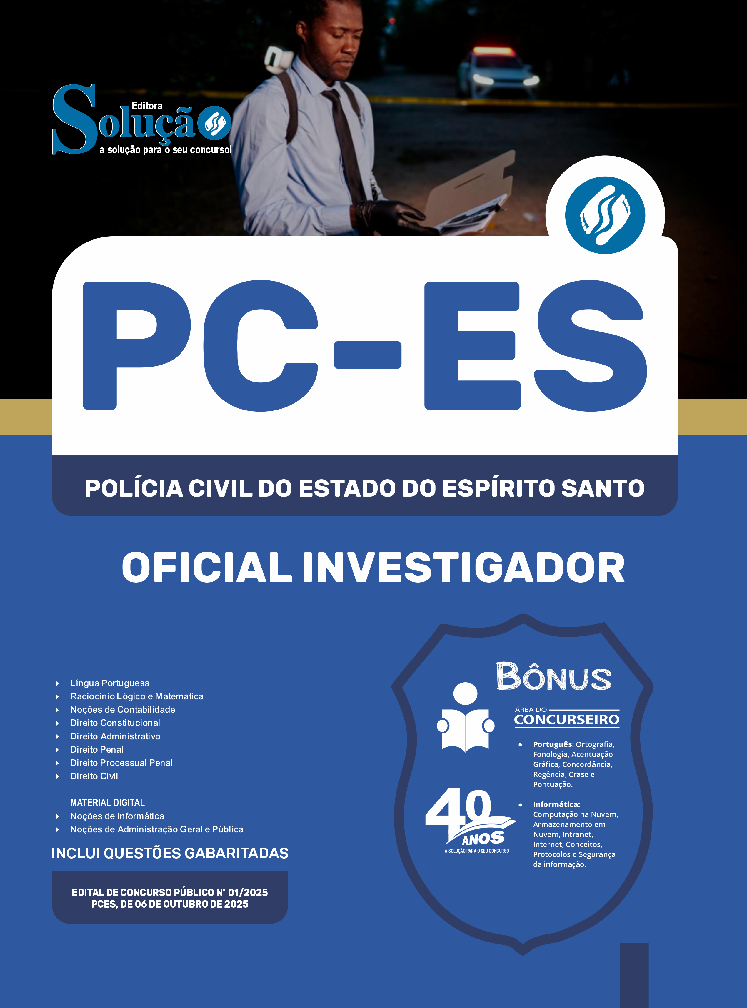 A Apostila Polícia Civil do Espírito Santo 2025 - Oficial Investigador de Polícia foi organizada para proporcionar um melhor rendimento na sua preparação, abordando cada conteúdo de forma objetiva e direcionada. Estude para o Concurso da Polícia Civil do Espírito Santo 2025 com um material de acordo com o Edital oficial para o cargo de Oficial Investigador de Polícia.