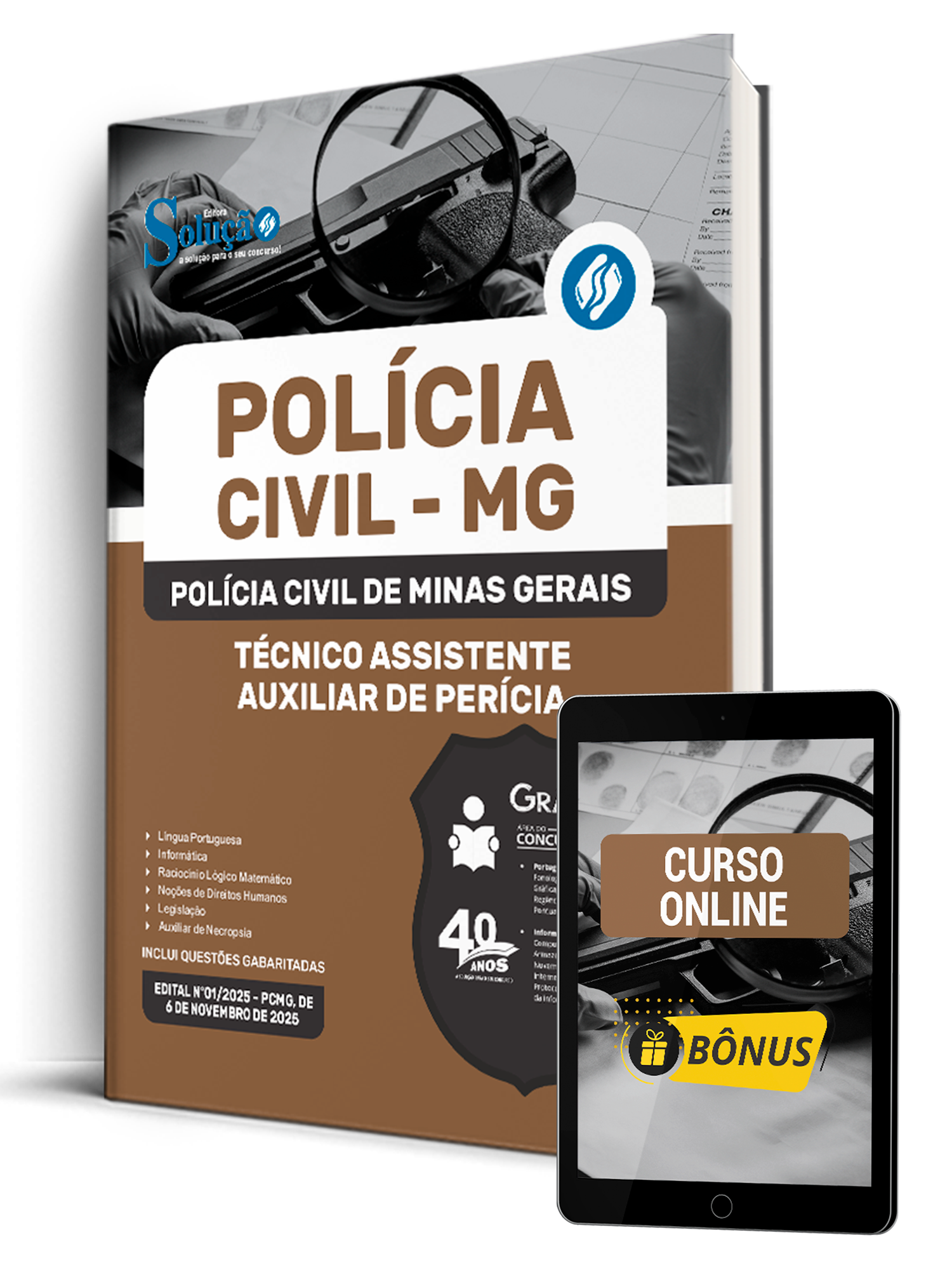 A Apostila Polícia Civil de Minas Gerais 2025 - Técnico Assistente - Auxiliar de Perícia foi organizada para proporcionar um melhor rendimento na sua preparação, abordando cada conteúdo de forma objetiva e direcionada. Estude para o Concurso da Polícia Civil de Minas Gerais 2025 com um material de acordo com o Edital oficial para o cargo de Técnico Assistente - Auxiliar de Perícia.
