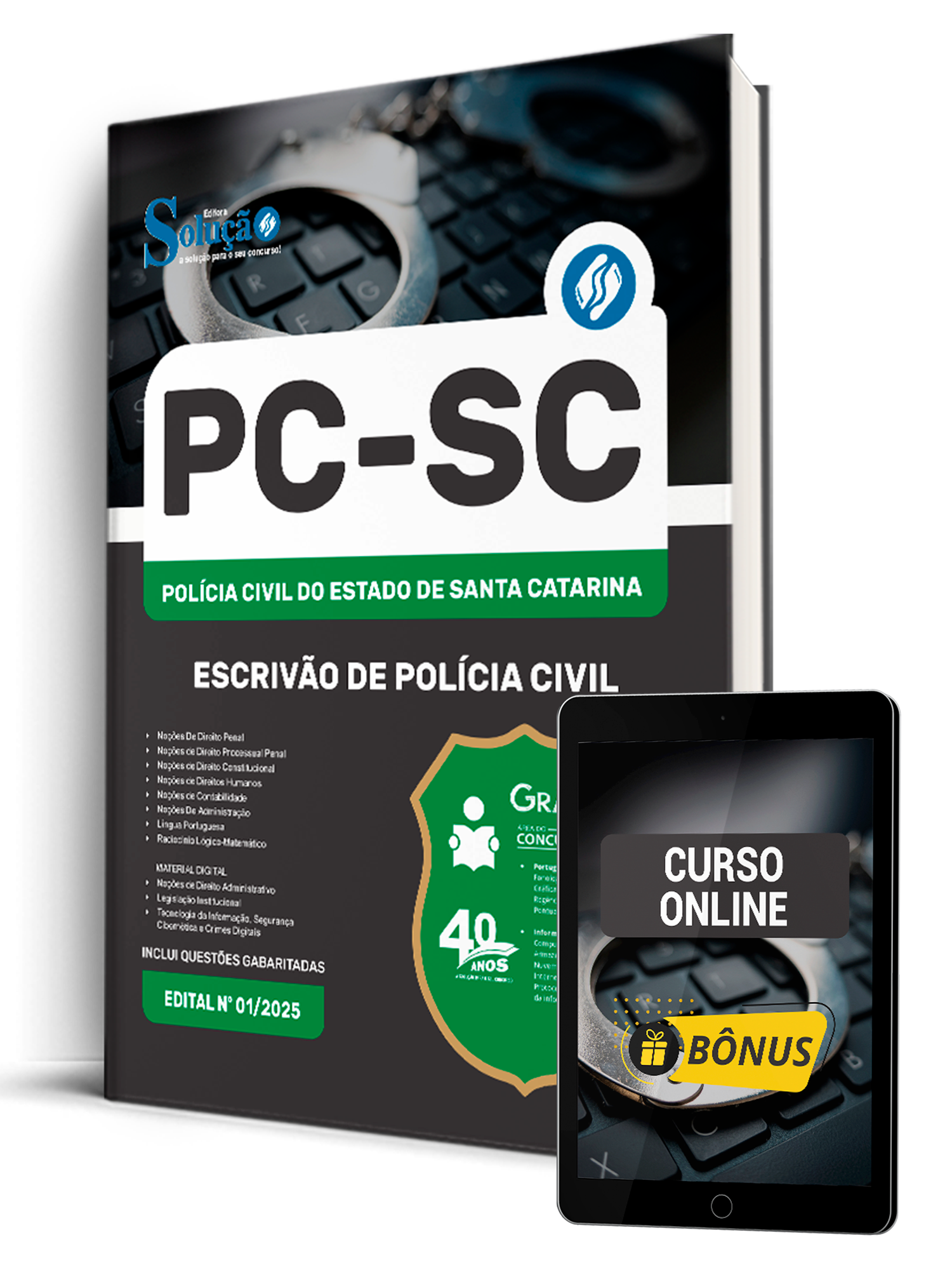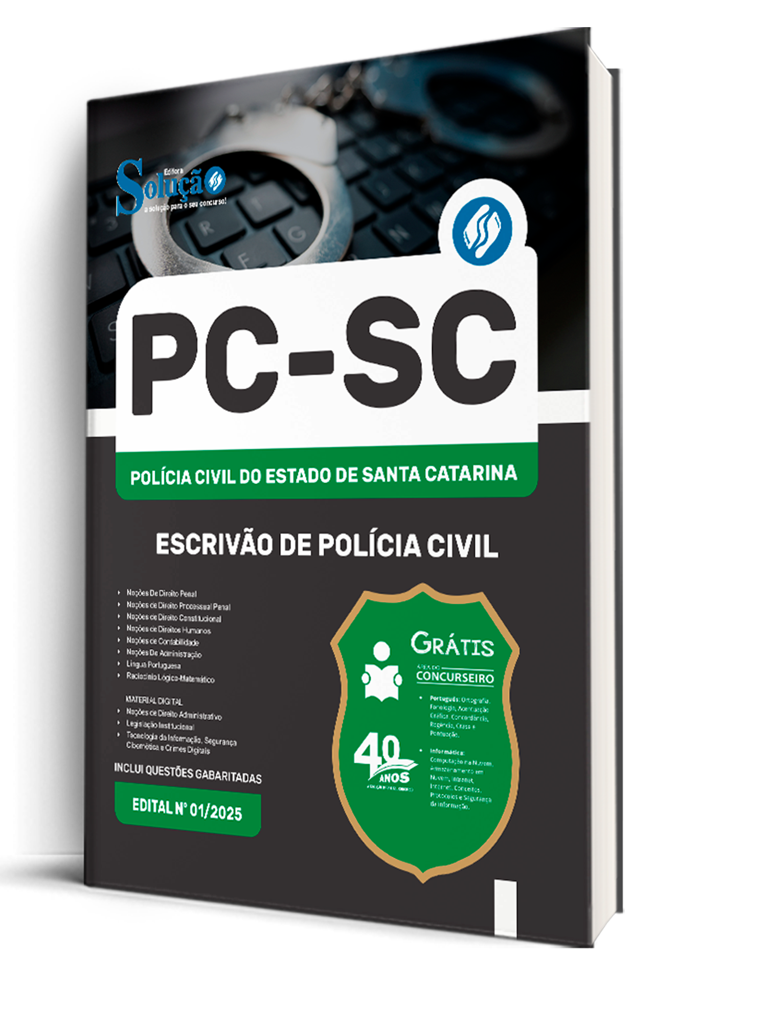 A Apostila Polícia Civil de Santa Catarina 02 - 2025 - Escrivão de Polícia Civil foi organizada para proporcionar um melhor rendimento na sua preparação, abordando cada conteúdo de forma objetiva e direcionada. Estude para o Concurso da Polícia Civil de Santa Catarina 02 - 2025 com um material de acordo com o Edital oficial para o cargo de Escrivão de Polícia Civil.