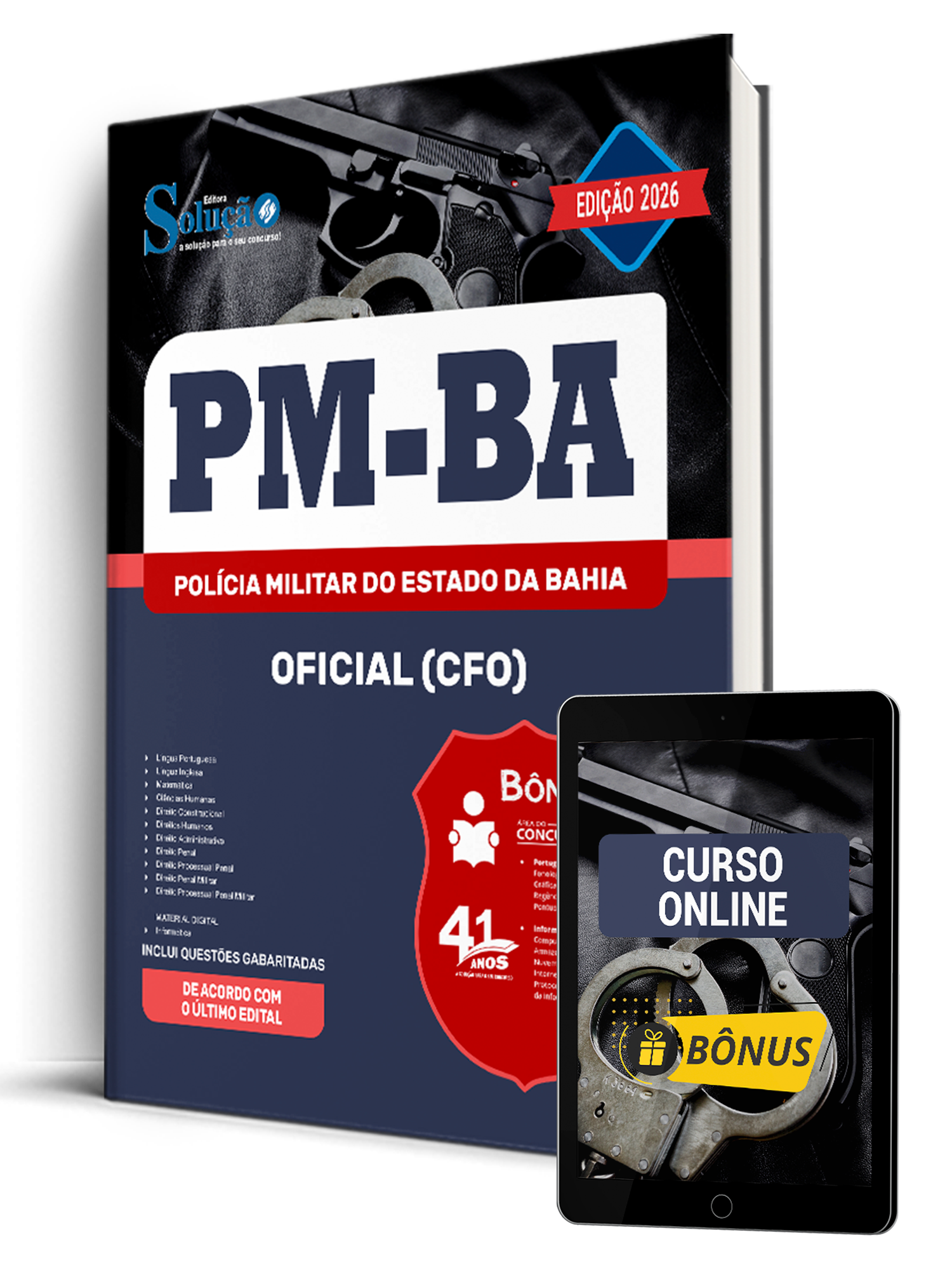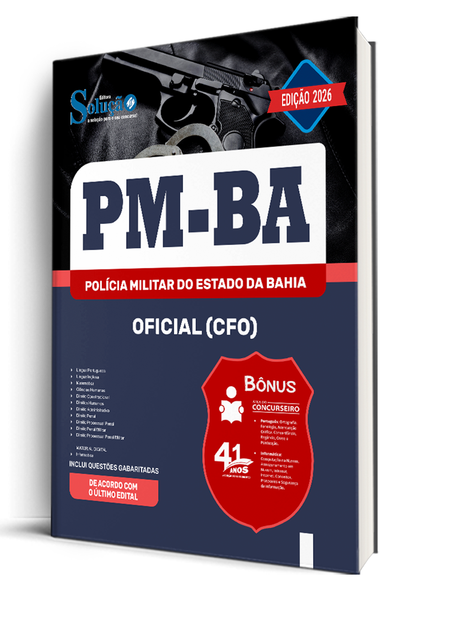 A Apostila Polícia Militar da Bahia 2026 - Oficial (CFO) foi organizada para proporcionar um melhor rendimento na sua preparação, abordando cada conteúdo de forma objetiva e direcionada. Estude para o Concurso da Polícia Militar da Bahia 2026 com um material de acordo com o Edital oficial para o cargo de Oficial (CFO).