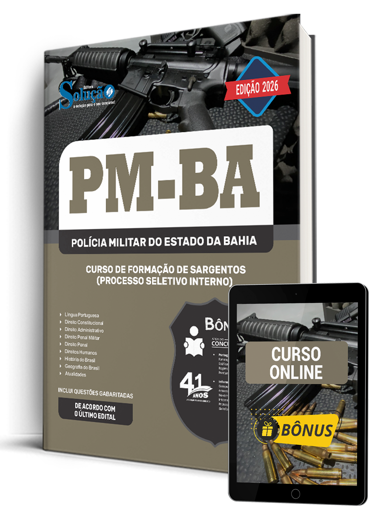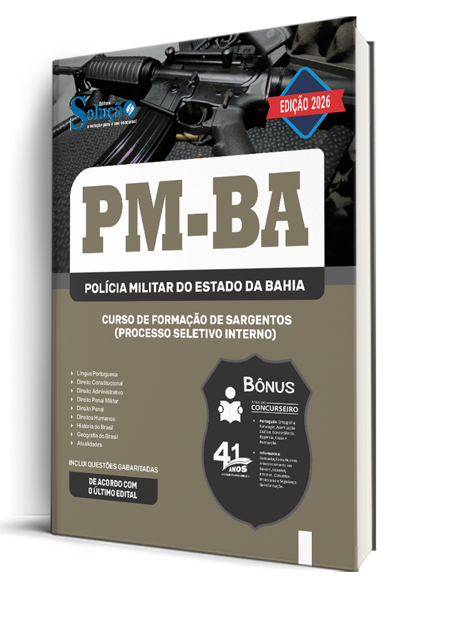 A Apostila Polícia Militar da Bahia 2026 - Curso de Formação de Sargentos (Processo Seletivo Interno) foi organizada para proporcionar um melhor rendimento na sua preparação, abordando cada conteúdo de forma objetiva e direcionada. Estude para o Concurso da Polícia Militar da Bahia 2026 com um material de acordo com o último Edital oficial para o cargo de Curso de Formação de Sargentos (Processo Seletivo Interno).