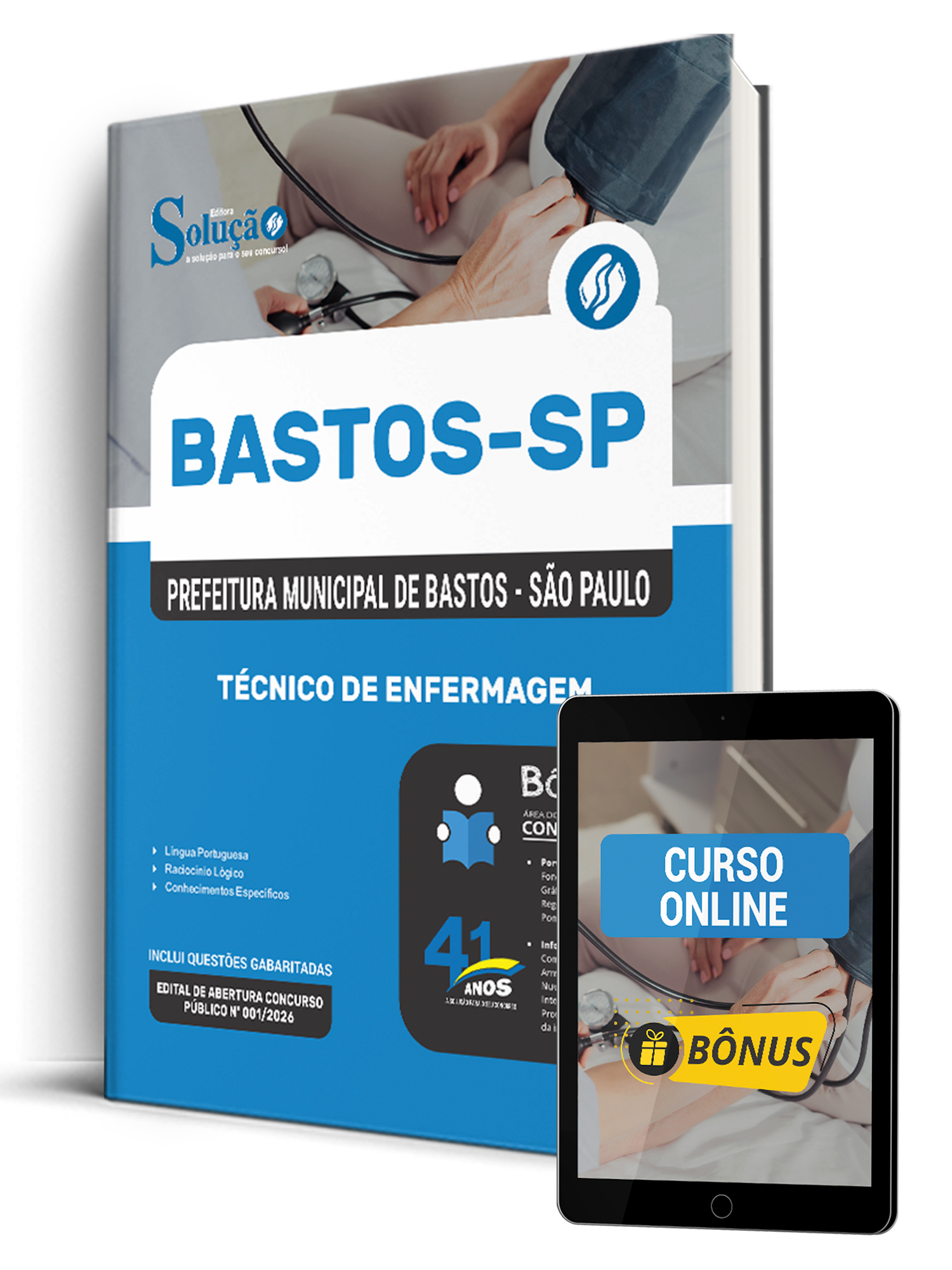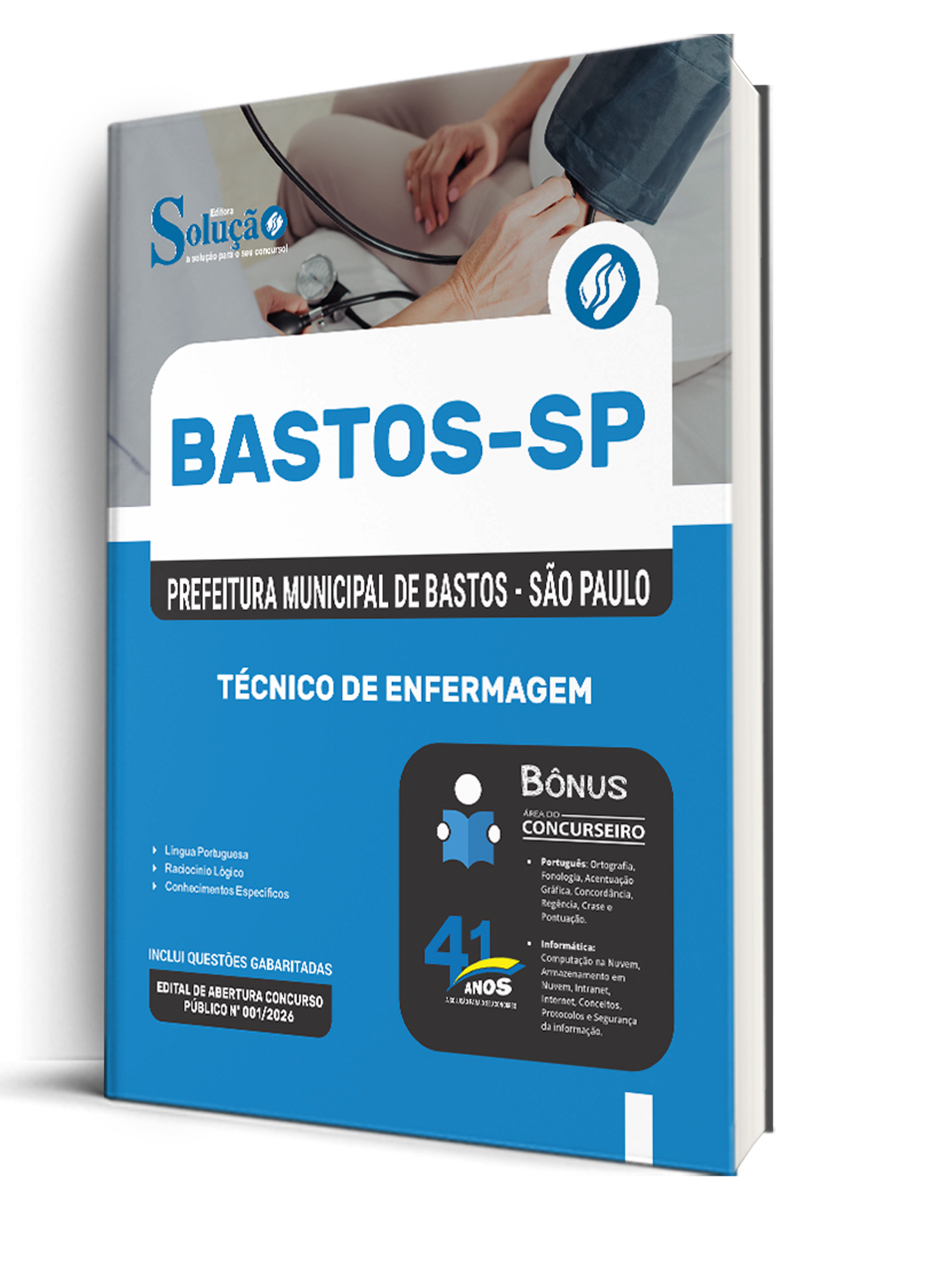 A Apostila Prefeitura Municipal de Bastos - SP 2026 - Técnico de Enfermagem foi organizada para proporcionar um melhor rendimento na sua preparação, abordando cada conteúdo de forma objetiva e direcionada. Estude para o Concurso da Prefeitura Municipal de Bastos - SP 2026 com um material de acordo com o Edital oficial para o cargo de Técnico de Enfermagem.
