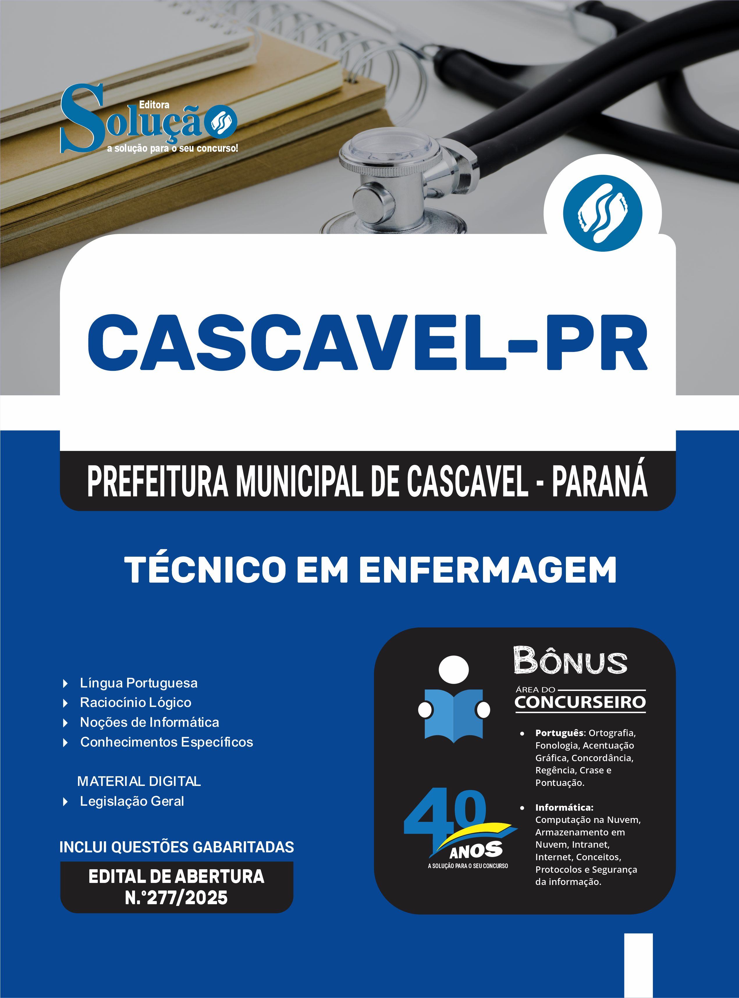 A Apostila Prefeitura Municipal de Cascavel - PR 277 - 2025 - Técnico em Enfermagem foi organizada para proporcionar um melhor rendimento na sua preparação, abordando cada conteúdo de forma objetiva e direcionada. Estude para o Concurso da Prefeitura Municipal de Cascavel - PR 277 - 2025 com um material de acordo com o Edital oficial para o cargo de Técnico em Enfermagem.
