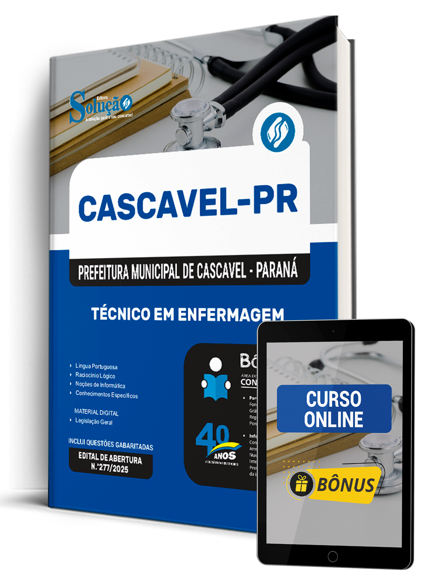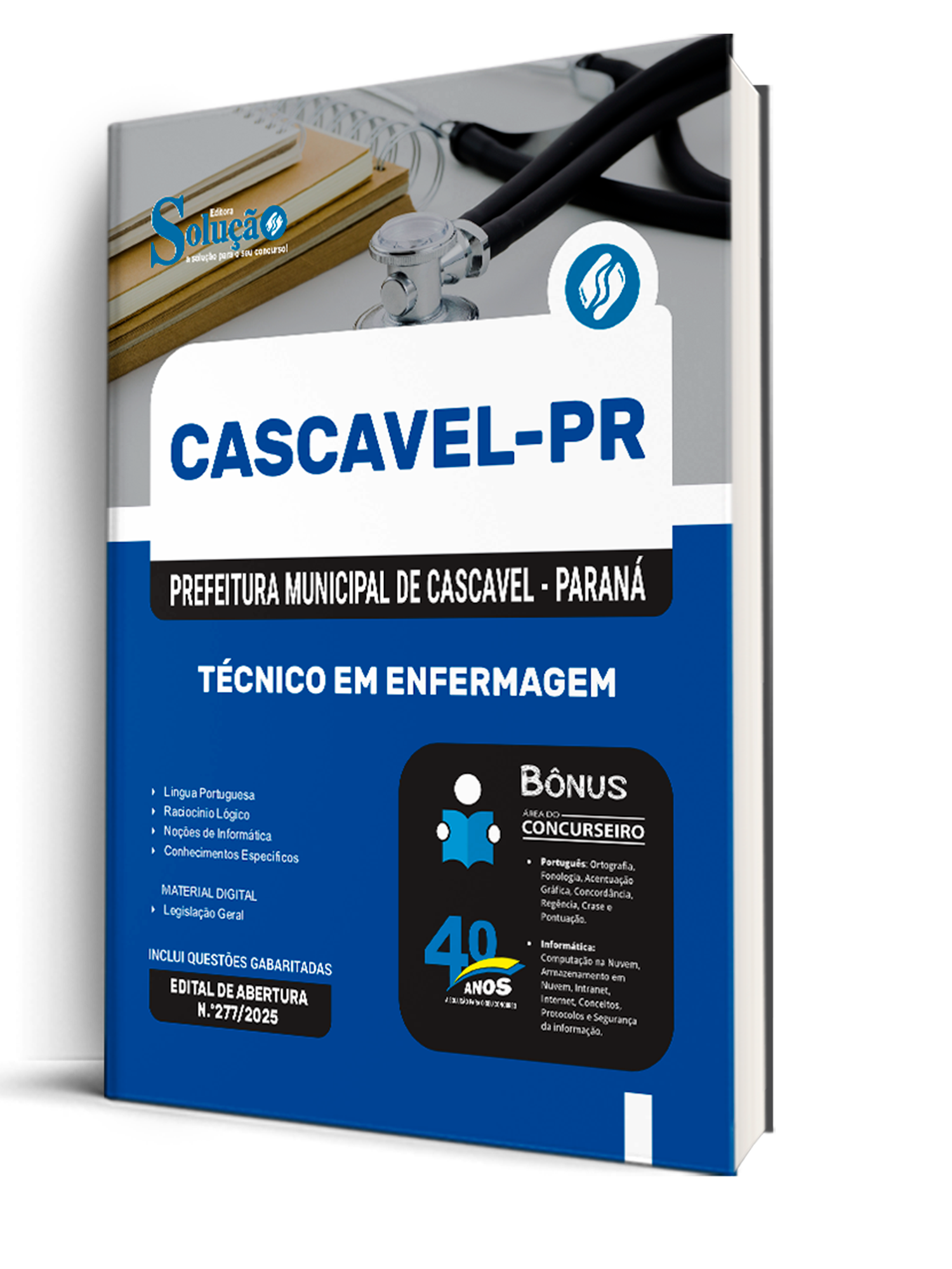 A Apostila Prefeitura Municipal de Cascavel - PR 277 - 2025 - Técnico em Enfermagem foi organizada para proporcionar um melhor rendimento na sua preparação, abordando cada conteúdo de forma objetiva e direcionada. Estude para o Concurso da Prefeitura Municipal de Cascavel - PR 277 - 2025 com um material de acordo com o Edital oficial para o cargo de Técnico em Enfermagem.