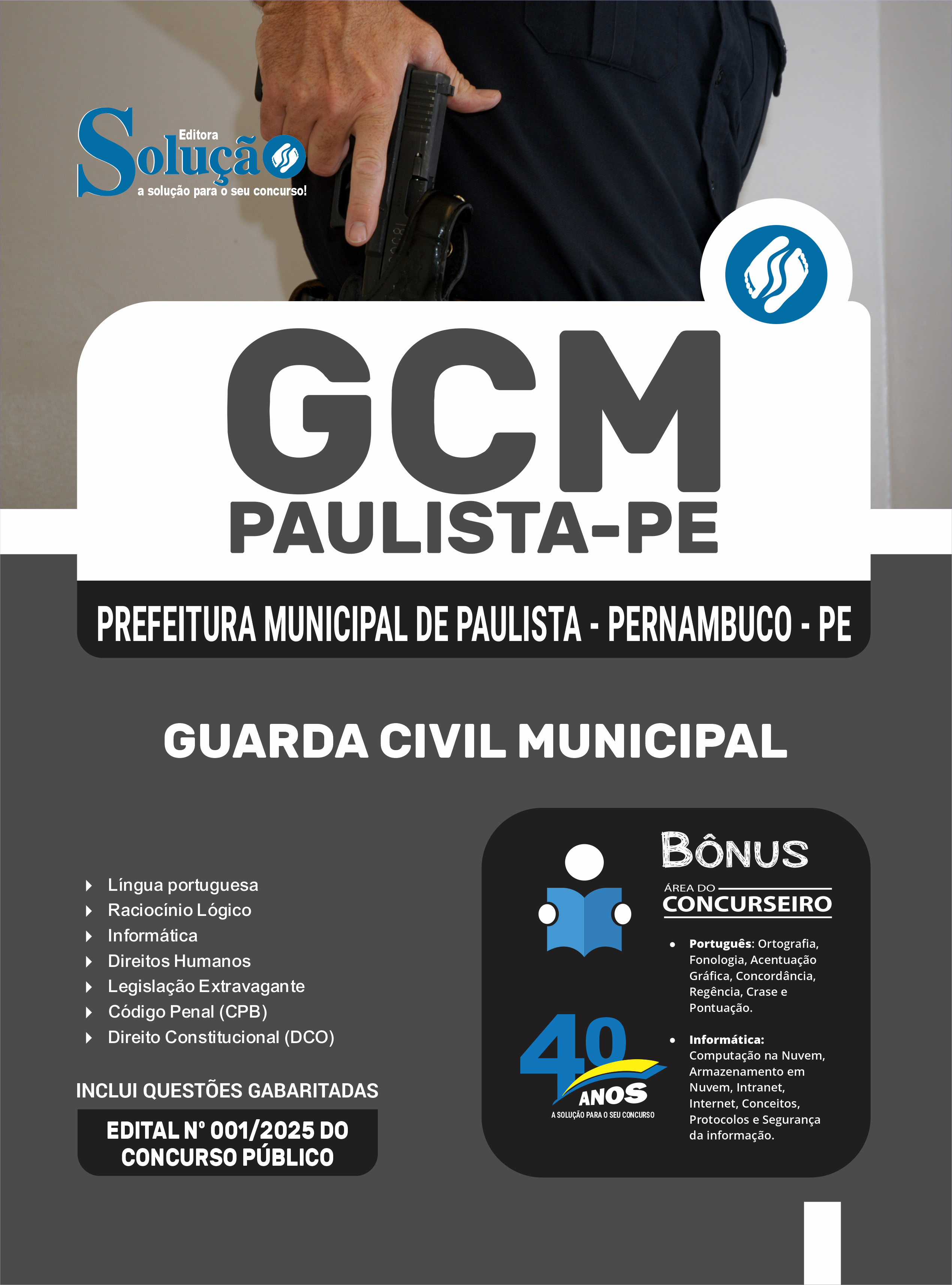A Apostila Prefeitura Municipal de Paulista - PE 2025 - Guarda Civil Municipal foi organizada para proporcionar um melhor rendimento na sua preparação, abordando cada conteúdo de forma objetiva e direcionada. Estude para o Concurso da Prefeitura Municipal de Paulista - PE 2025 com um material de acordo com o Edital oficial para o cargo de Guarda Civil Municipal.