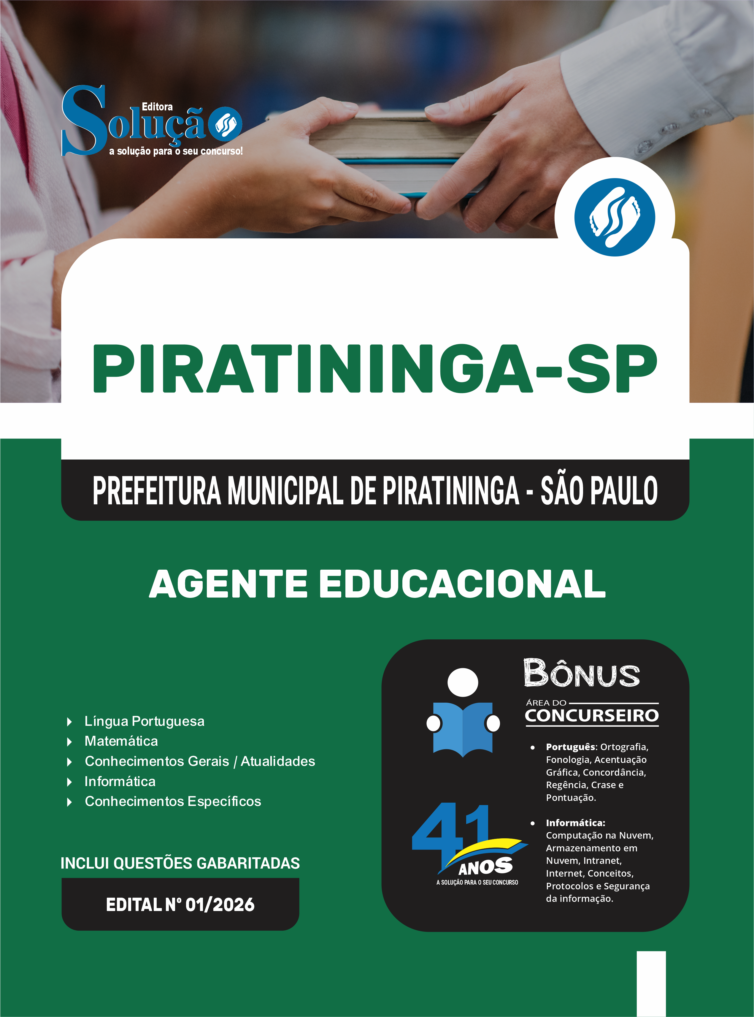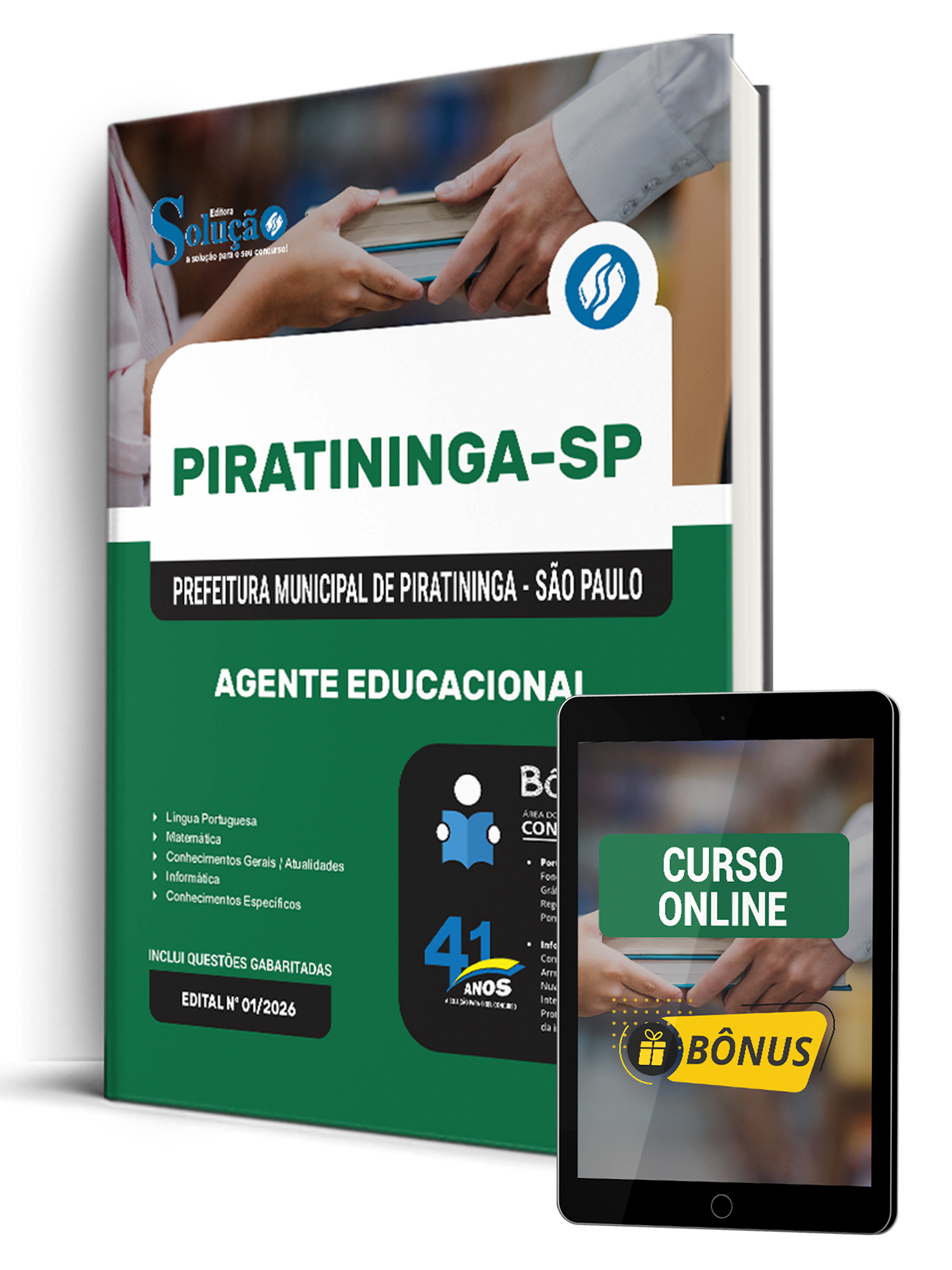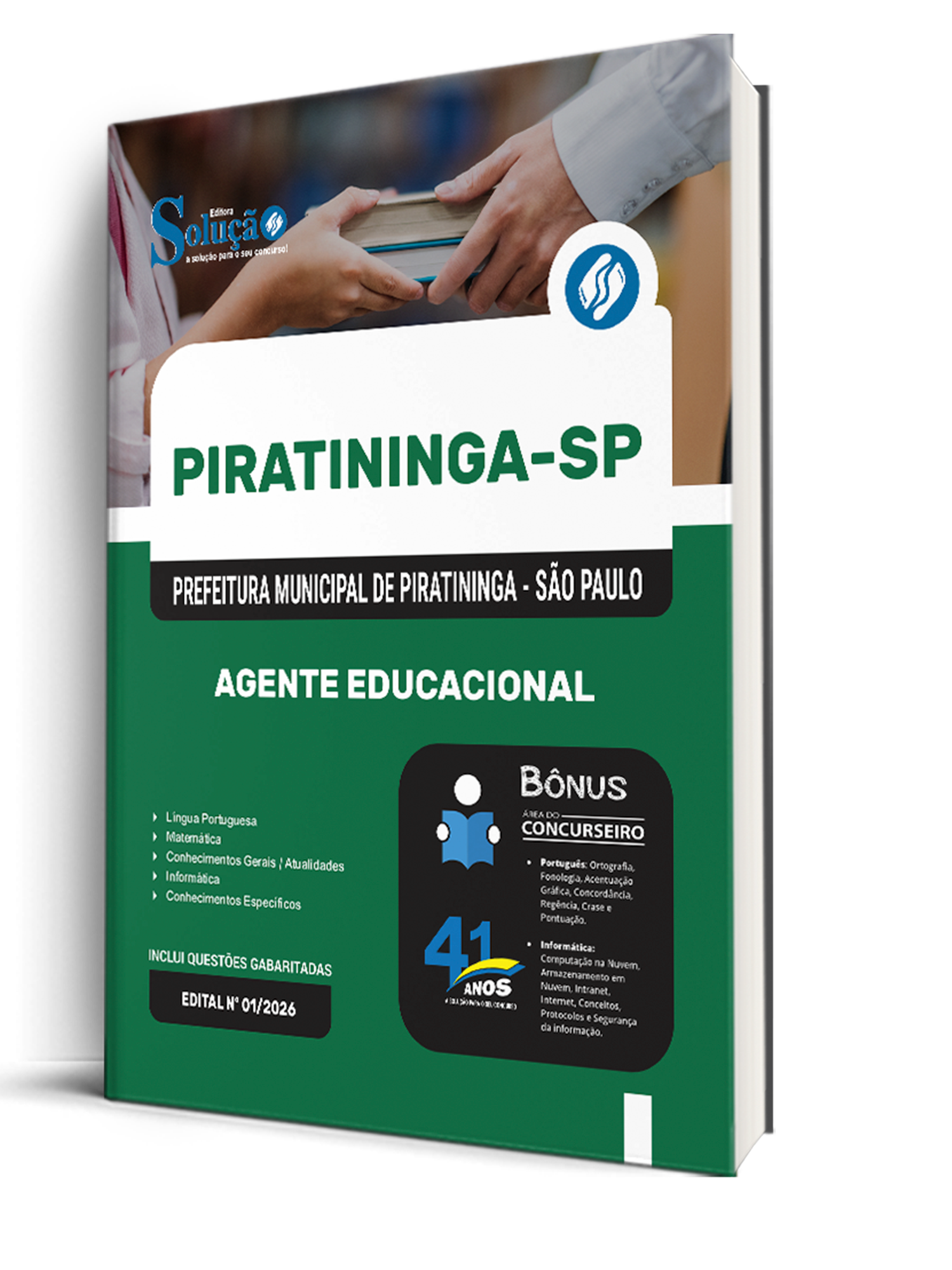 A Apostila Prefeitura Municipal de Piratininga - SP 2026 - Agente Educacional foi organizada para proporcionar um melhor rendimento na sua preparação, abordando cada conteúdo de forma objetiva e direcionada. Estude para o Concurso da Prefeitura Municipal de Piratininga - SP 2026 com um material de acordo com o Edital oficial para o cargo de Agente Educacional.