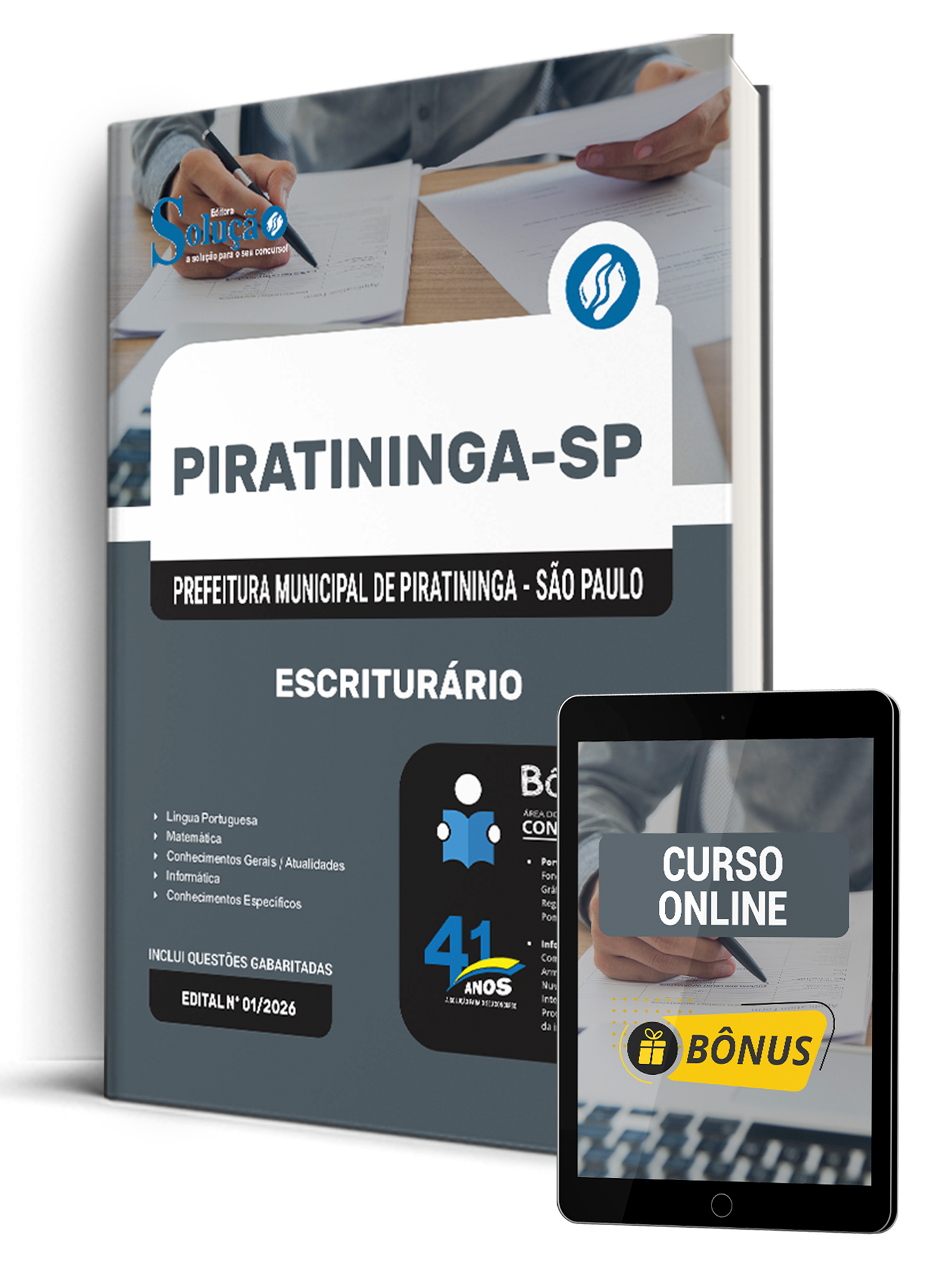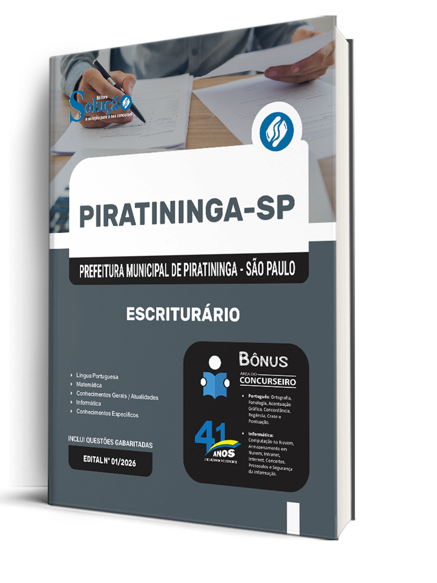 A Apostila Prefeitura Municipal de Piratininga - SP 2026 - Escriturário foi organizada para proporcionar um melhor rendimento na sua preparação, abordando cada conteúdo de forma objetiva e direcionada. Estude para o Concurso da Prefeitura Municipal de Piratininga - SP 2026 com um material de acordo com o Edital oficial para o cargo de Escriturário.