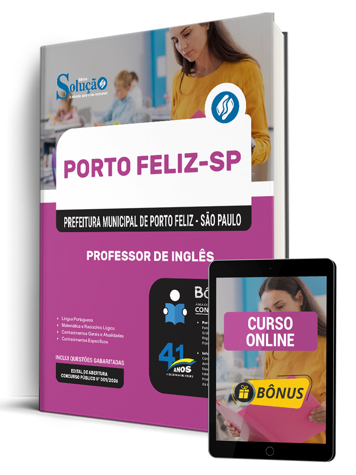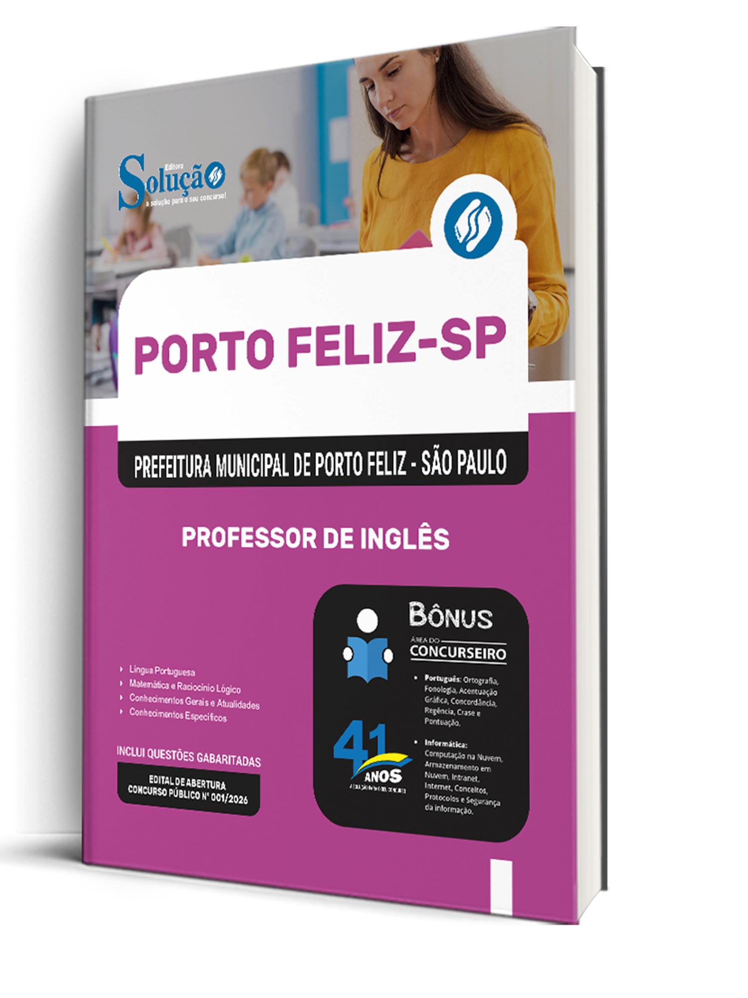 A Apostila Prefeitura Municipal de Porto Feliz - SP 2026 - Professor de Inglês foi organizada para proporcionar um melhor rendimento na sua preparação, abordando cada conteúdo de forma objetiva e direcionada. Estude para o Concurso da Prefeitura Municipal de Porto Feliz - SP 2026 com um material de acordo com o Edital oficial para o cargo de Professor de Inglês.