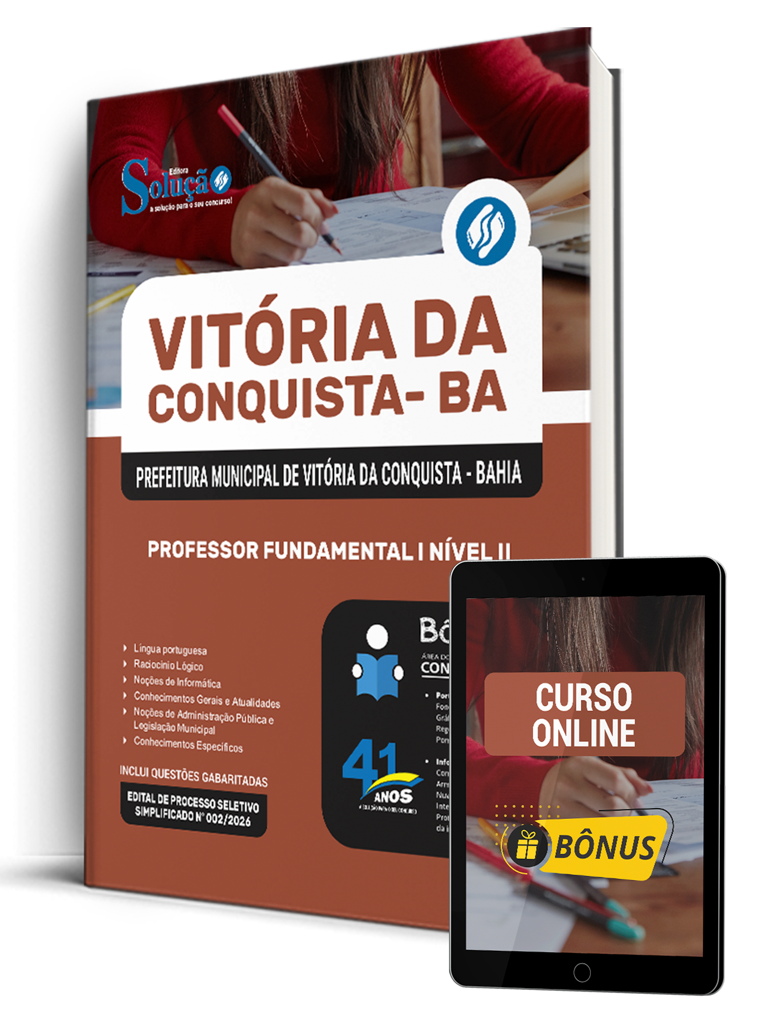 A Apostila Prefeitura Municipal de Vitória da Conquista - BA 2026 - Professor Fundamental I - Nível II foi organizada para proporcionar um melhor rendimento na sua preparação, abordando cada conteúdo de forma objetiva e direcionada. Estude para o Concurso da Prefeitura Municipal de Vitória da Conquista - BA 2026 com um material de acordo com o Edital oficial para o cargo de Professor Fundamental I - Nível II.