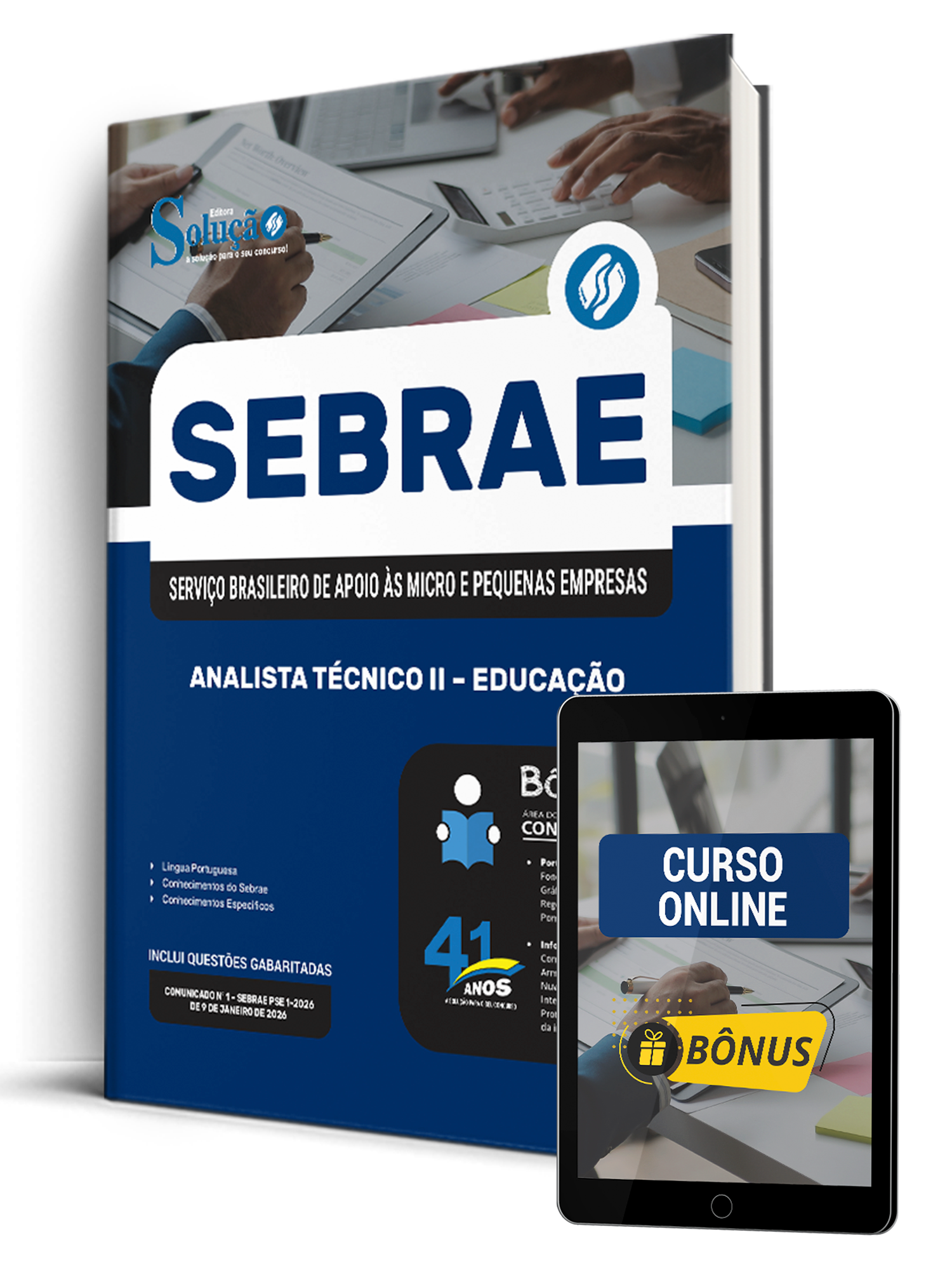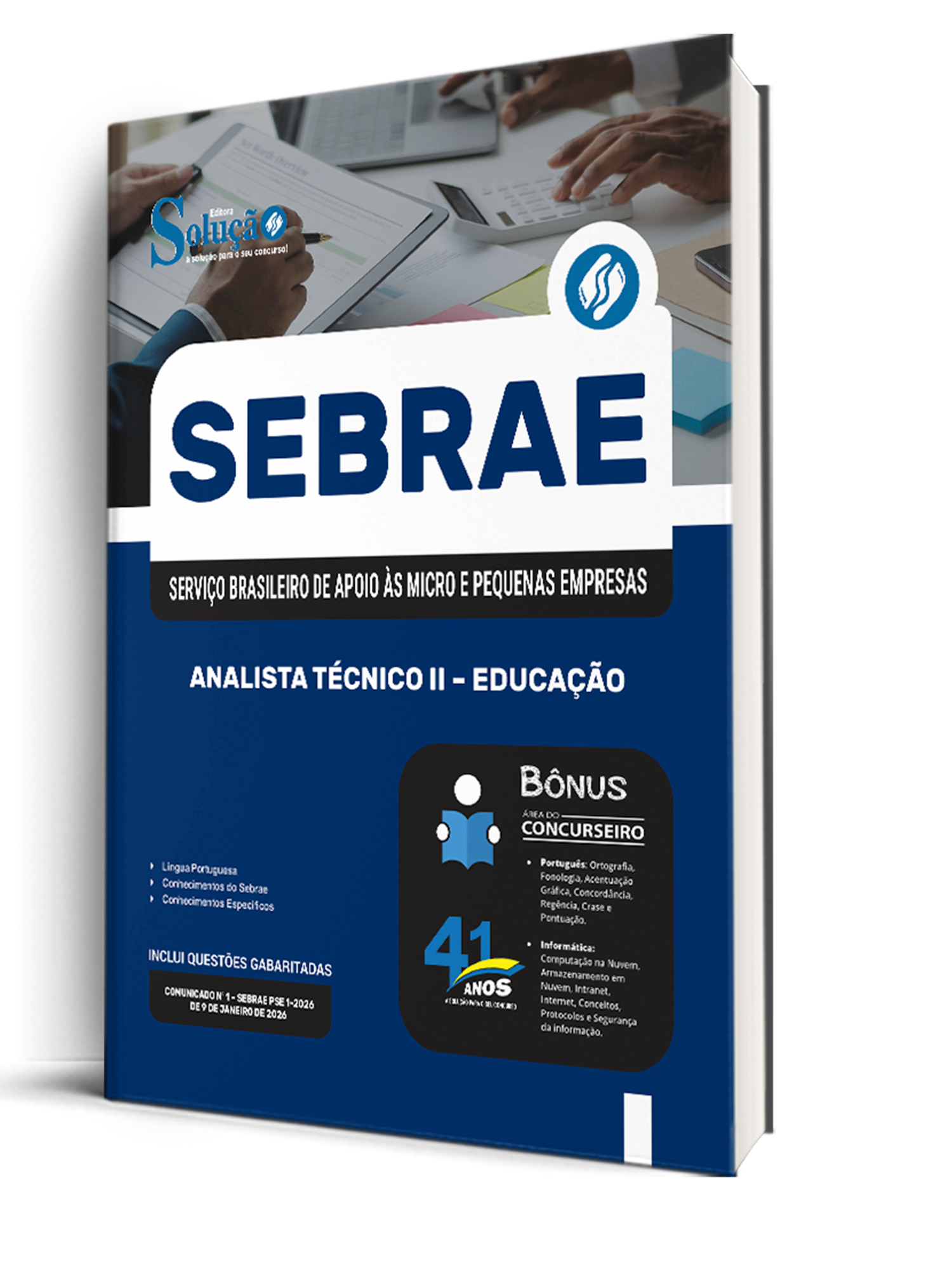 A Apostila Serviço Brasileiro de Apoio às Micro e Pequenas Empresas (Sebrae) 2026 - Analista Técnico II - Educação foi organizada para proporcionar um melhor rendimento na sua preparação, abordando cada conteúdo de forma objetiva e direcionada. Estude para o Concurso da Serviço Brasileiro de Apoio às Micro e Pequenas Empresas (Sebrae) 2026 com um material de acordo com o Edital oficial para o cargo de Analista Técnico II - Educação.