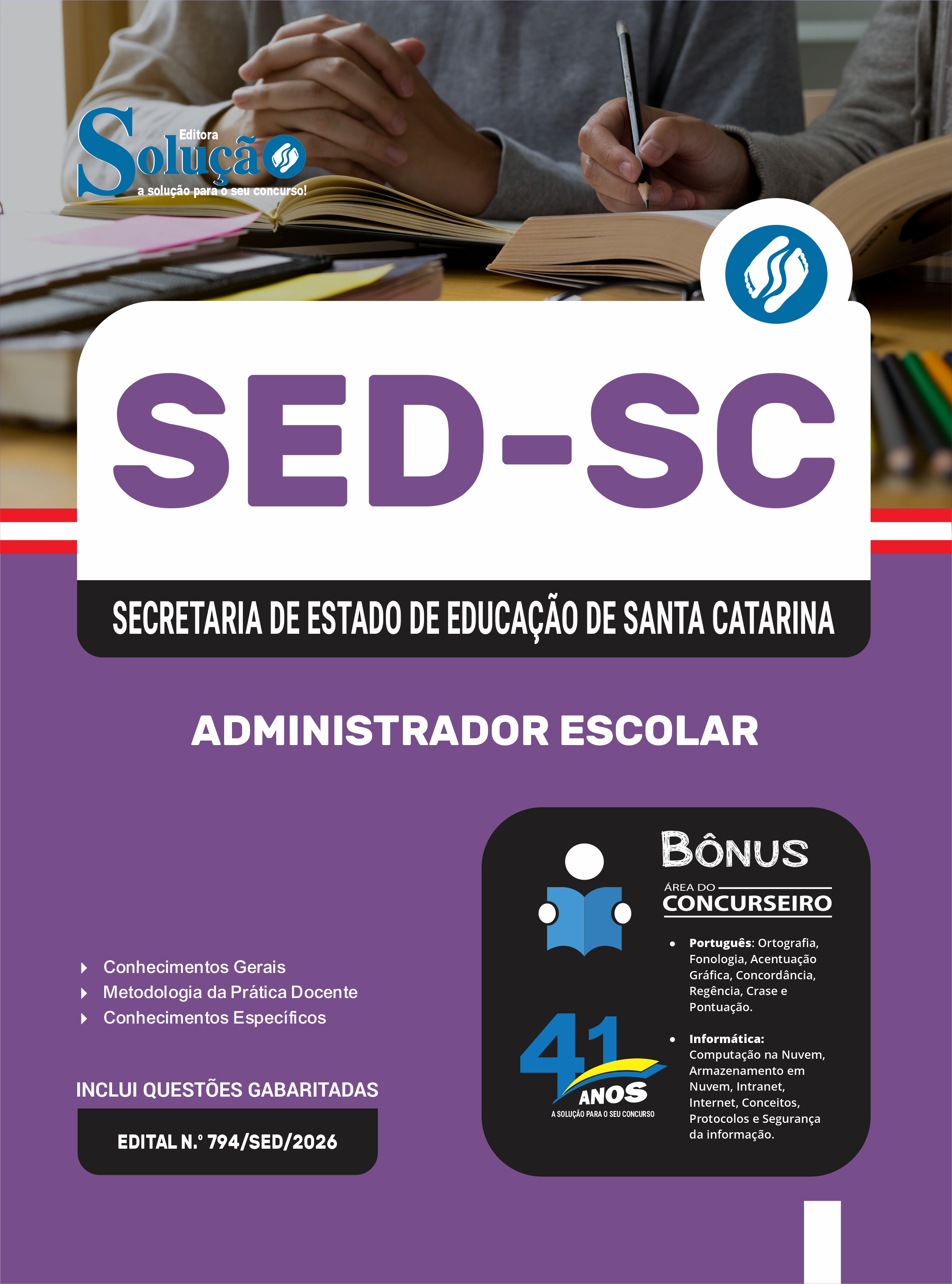 A Apostila Secretaria de Estado da Educação de Santa Catarina 2026 - Administrador Escolar foi organizada para proporcionar um melhor rendimento na sua preparação, abordando cada conteúdo de forma objetiva e direcionada. Estude para o Concurso da Secretaria de Estado da Educação de Santa Catarina 2026 com um material de acordo com o Edital oficial para o cargo de Administrador Escolar.