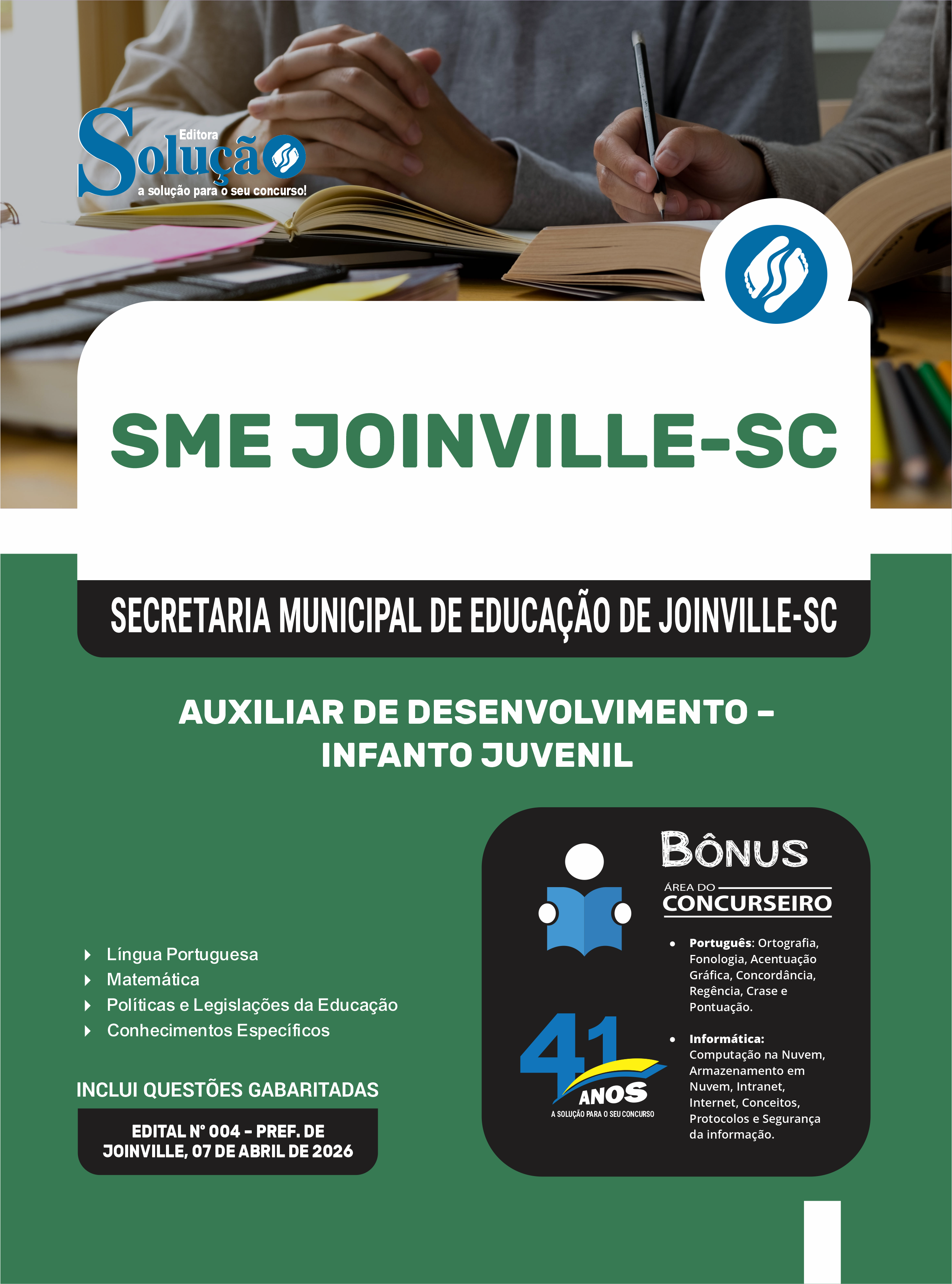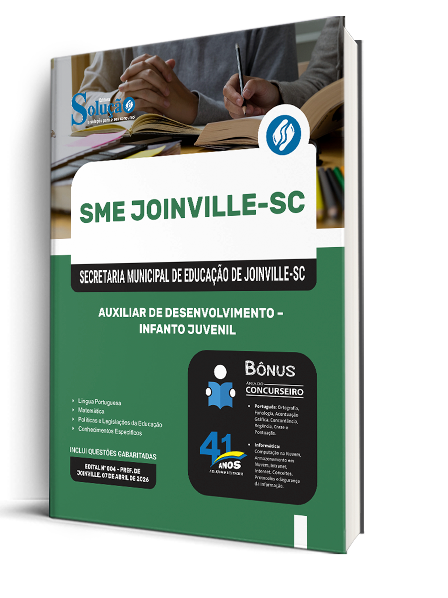 A Apostila Secretaria Municipal de Educação de Joinville-SC 2026 - Auxiliar de Desenvolvimento - Infanto Juvenil foi organizada para proporcionar um melhor rendimento na sua preparação, abordando cada conteúdo de forma objetiva e direcionada. Estude para o Concurso da Secretaria Municipal de Educação de Joinville-SC 2026 com um material de acordo com o Edital oficial para o cargo de Auxiliar de Desenvolvimento - Infanto Juvenil.