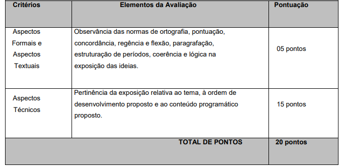 A avaliação, então, será constituída de uma prova escrita com 01 questão discursiva (redação) visando avaliar o conhecimento técnico na área de atuação da especialidade, a capacidade de expressão na modalidade escrita e o uso das normas do registro formal padrão da Língua Portuguesa.
