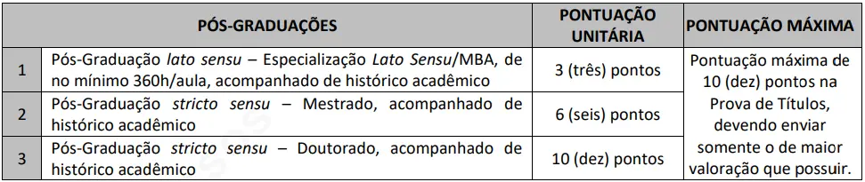 Destinada aos cargos da área da educação, essa etapa será classificatória, com pontuação máxima de 10 pontos. Será aceito apenas um título por candidato, conforme a maior titulação: