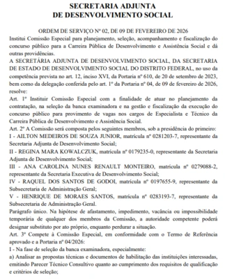 Nesta quarta-feira, 11 de fevereiro, foi publicado no Diário Oficial do Distrito Federal o documento que institui a comissão organizadora do concurso Sedes DF, marcando um avanço importante rumo à publicação do novo edital.