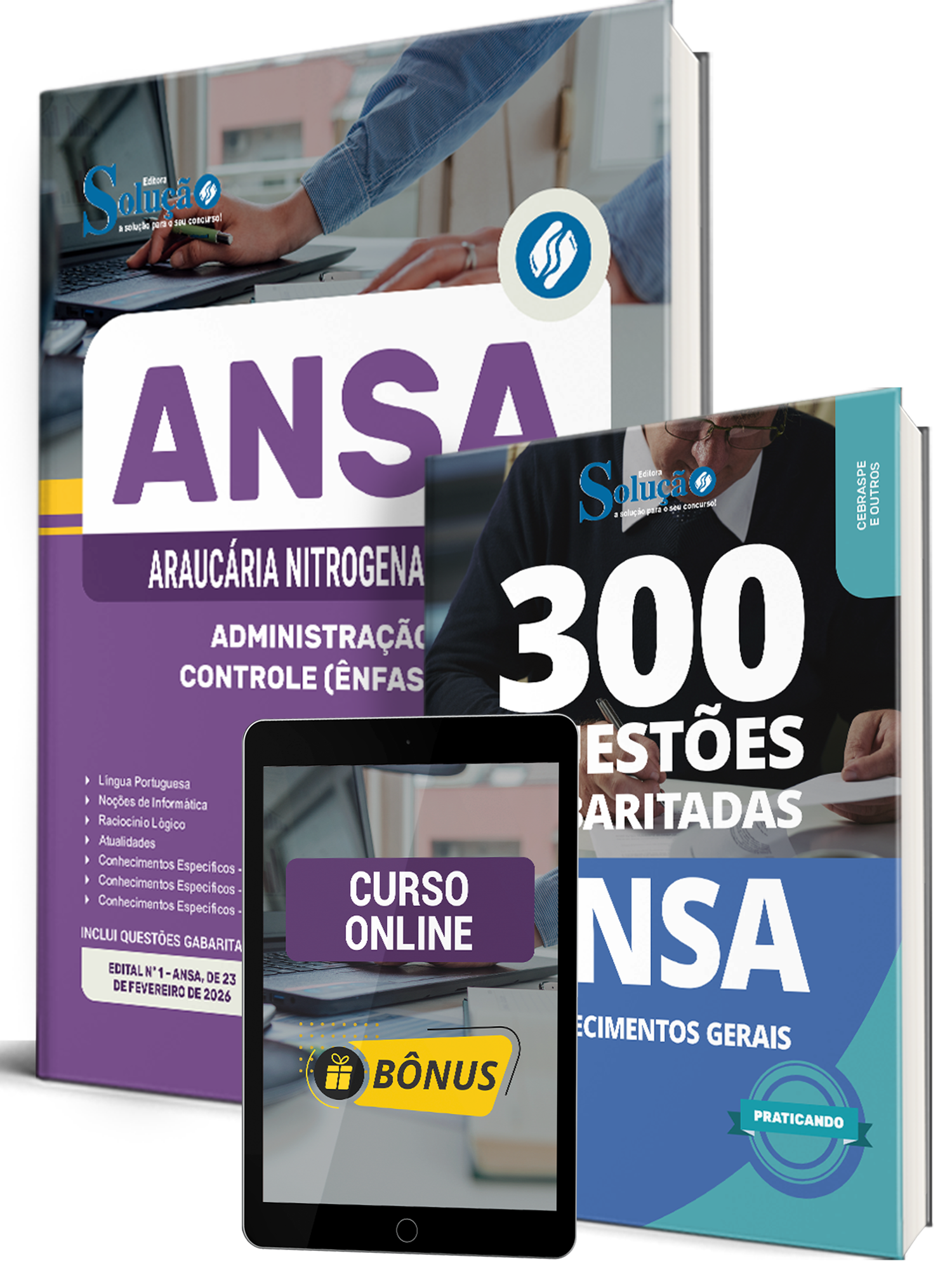 - Caderno de Questões ANSA - Conhecimentos Gerais - 300 Questões Gabaritadas: traz questões cuidadosamente selecionadas pela nossa equipe editorial, de acordo com o edital mais recente do concurso.