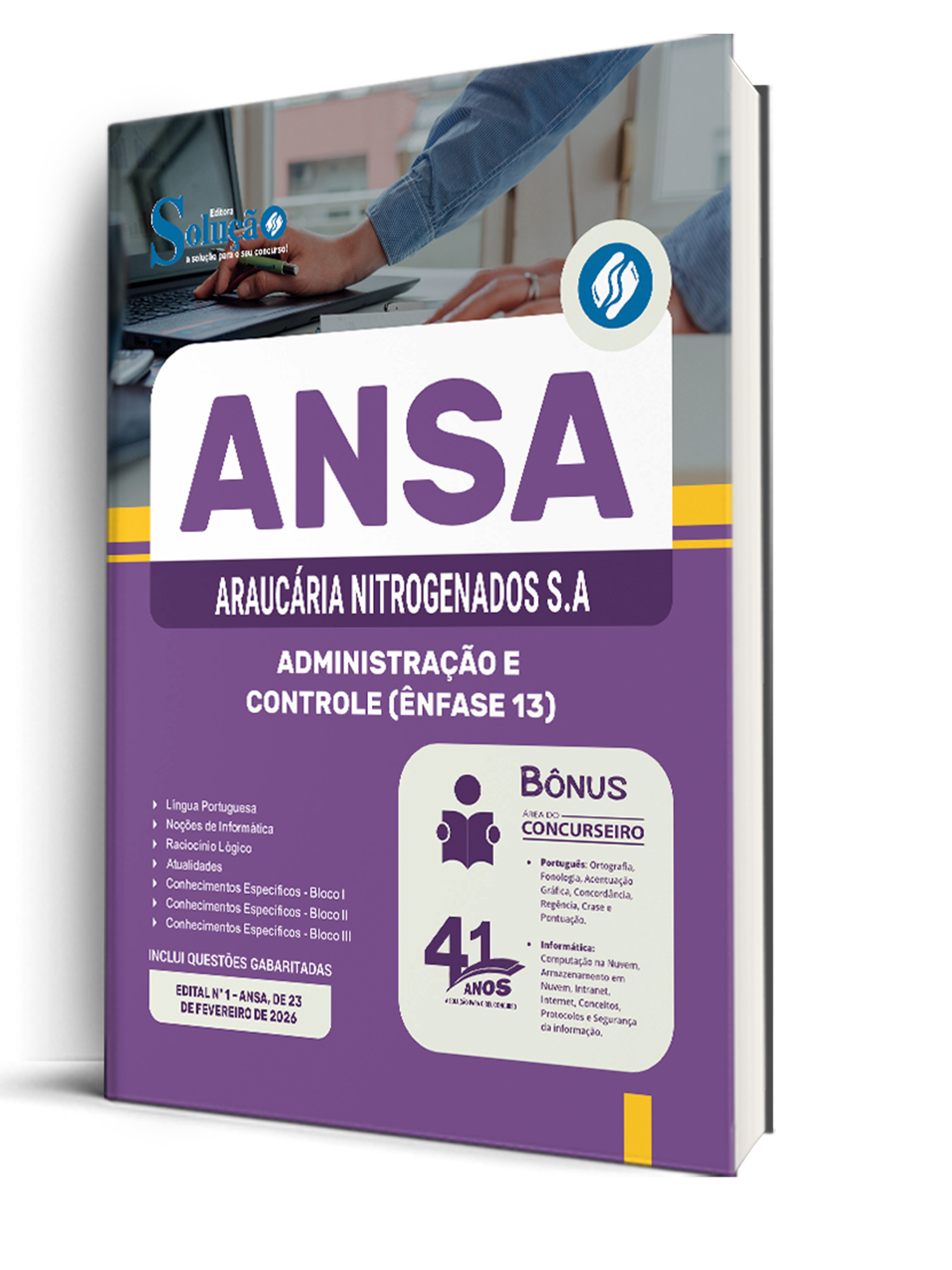 - Apostila ANSA 2026 - Ênfase 13: Administração e Controle: traz toda a teoria necessária de forma escrita e com exercícios; de acordo com o último edital e elaborado por nossa equipe de professores especializados em concursos.