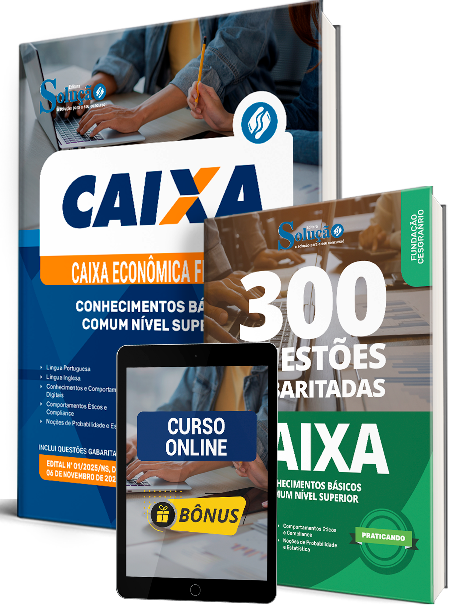 - Apostila CAIXA 2025 - Conhecimentos Básicos - Comum Nível Superior: traz toda a teoria necessária de forma escrita e com exercícios; de acordo com o último edital e elaborado por nossa equipe de professores especializados em concursos.