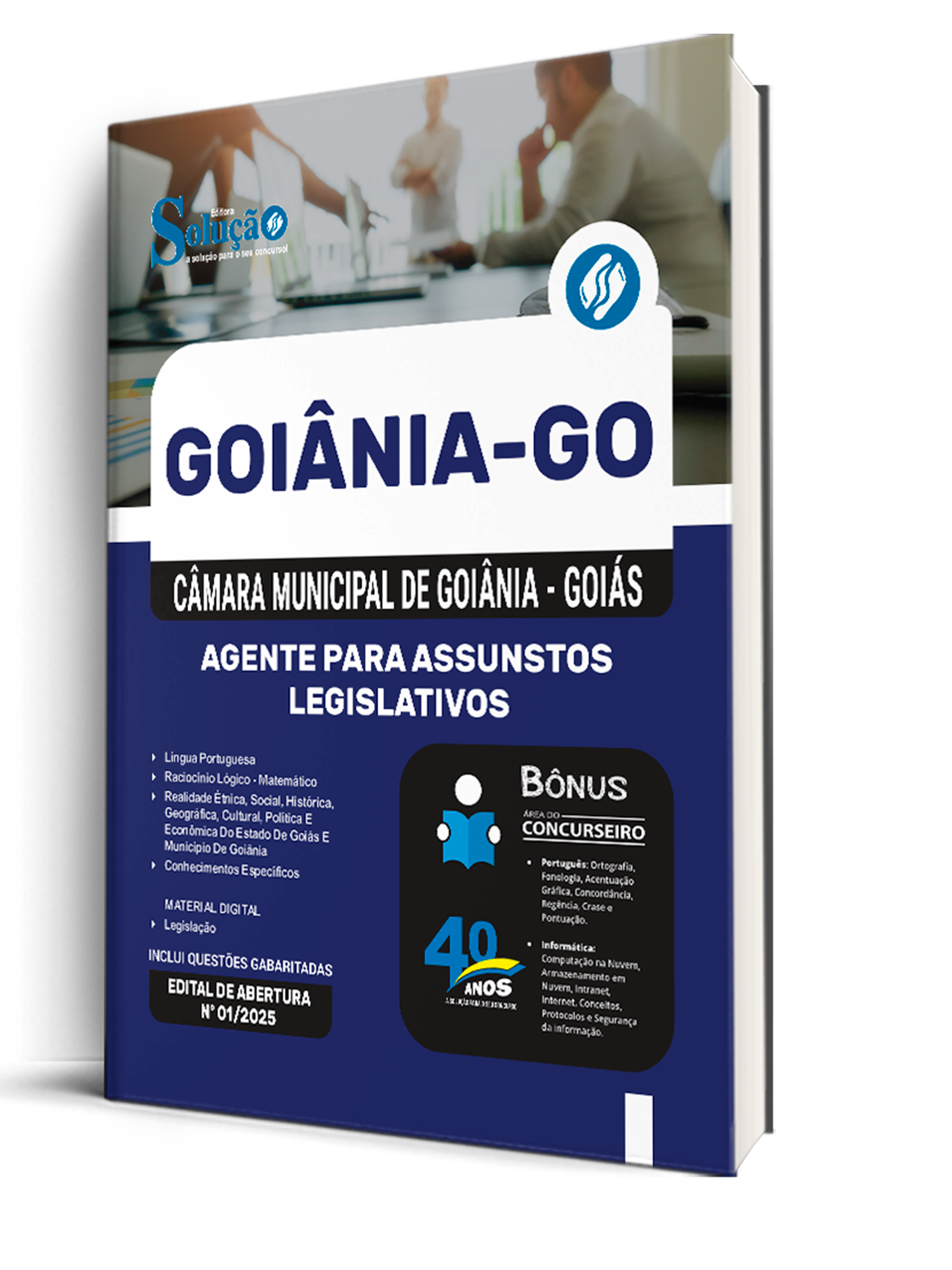 - Apostila Câmara de Goiânia - GO 2026 - Agente para Assuntos Legislativos: traz toda a teoria necessária de forma escrita e com exercícios; de acordo com o último edital e elaborado por nossa equipe de professores especializados em concursos.