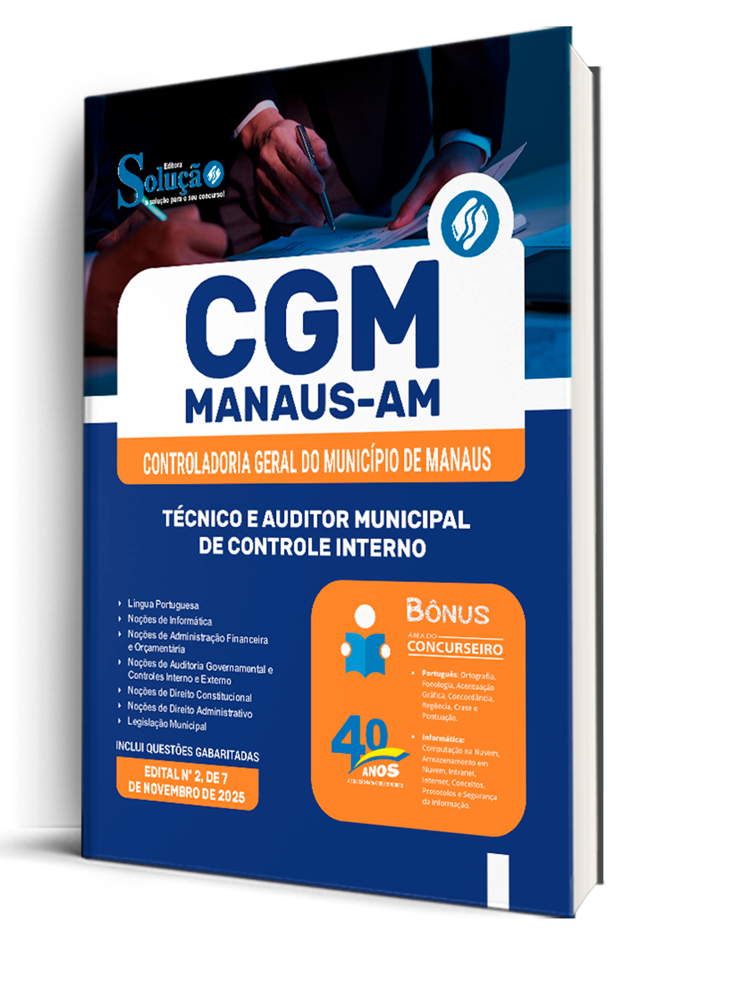 - Apostila CGM Manaus-AM 2025 - Técnico Municipal de Controle Interno: traz toda a teoria necessária de forma escrita e com exercícios; de acordo com o último edital e elaborado por nossa equipe de professores especializados em concursos.