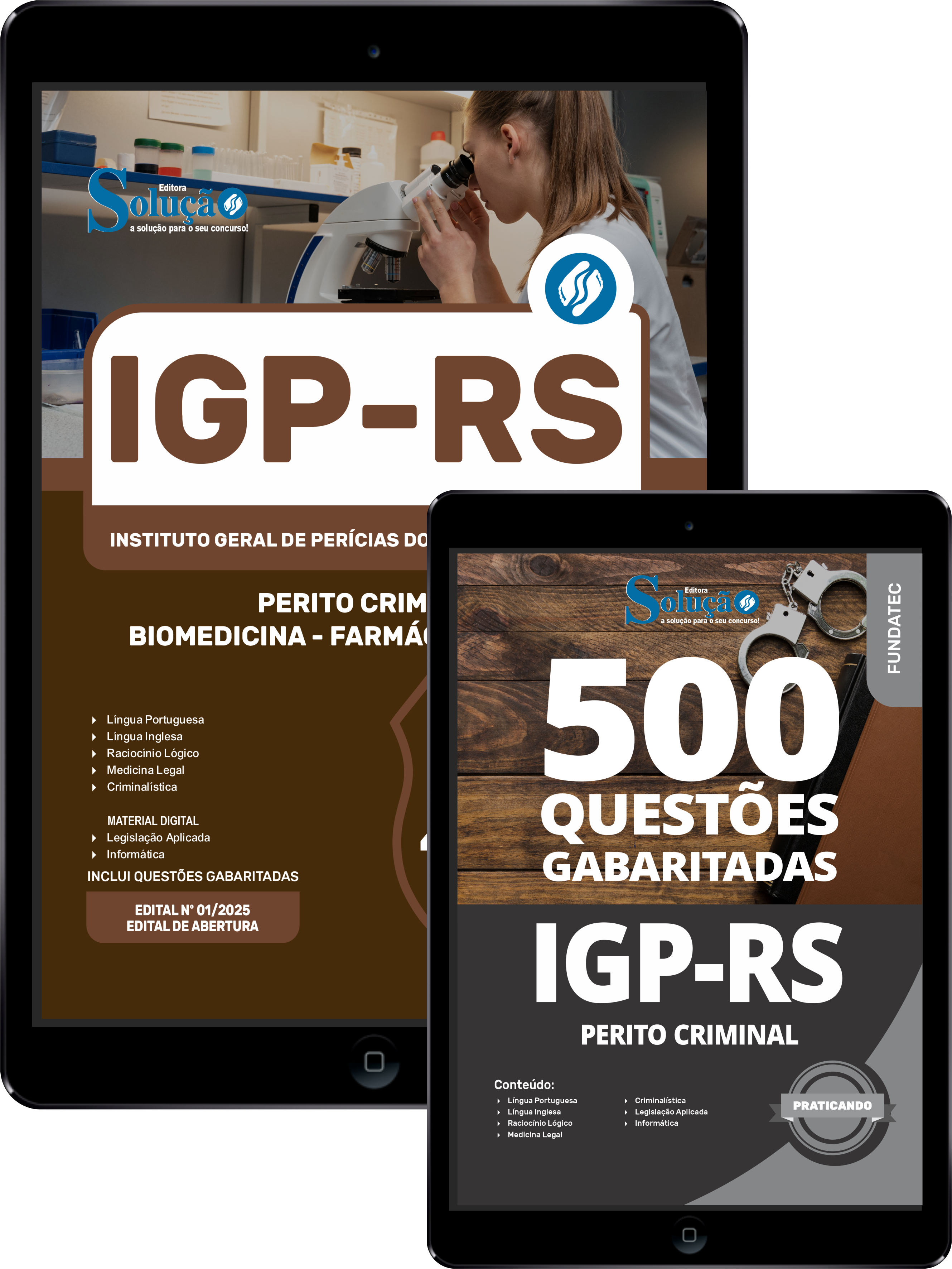 - Apostila IGP-RS 2025 - Perito Criminal - Biomedicina - Farmácia - Biologia: traz toda a teoria necessária de forma escrita e com exercícios; de acordo com o último edital e elaborado por nossa equipe de professores especializados em concursos.