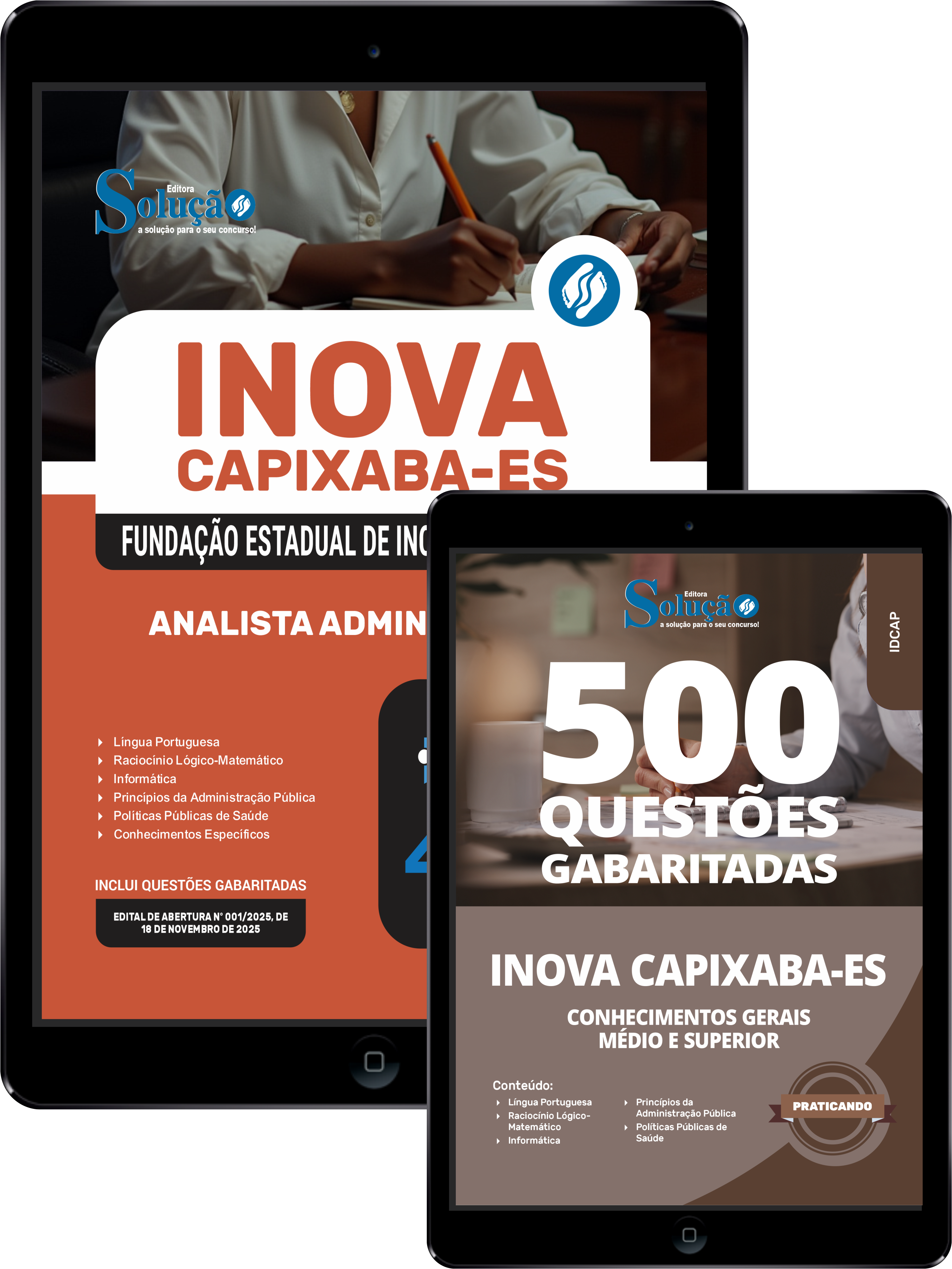 - Caderno de Questões INOVA Capixaba - Conhecimentos Gerais - Médio e Superior - 500 Questões Gabaritadas: traz questões cuidadosamente selecionadas pela nossa equipe editorial, de acordo com o edital mais recente do concurso.