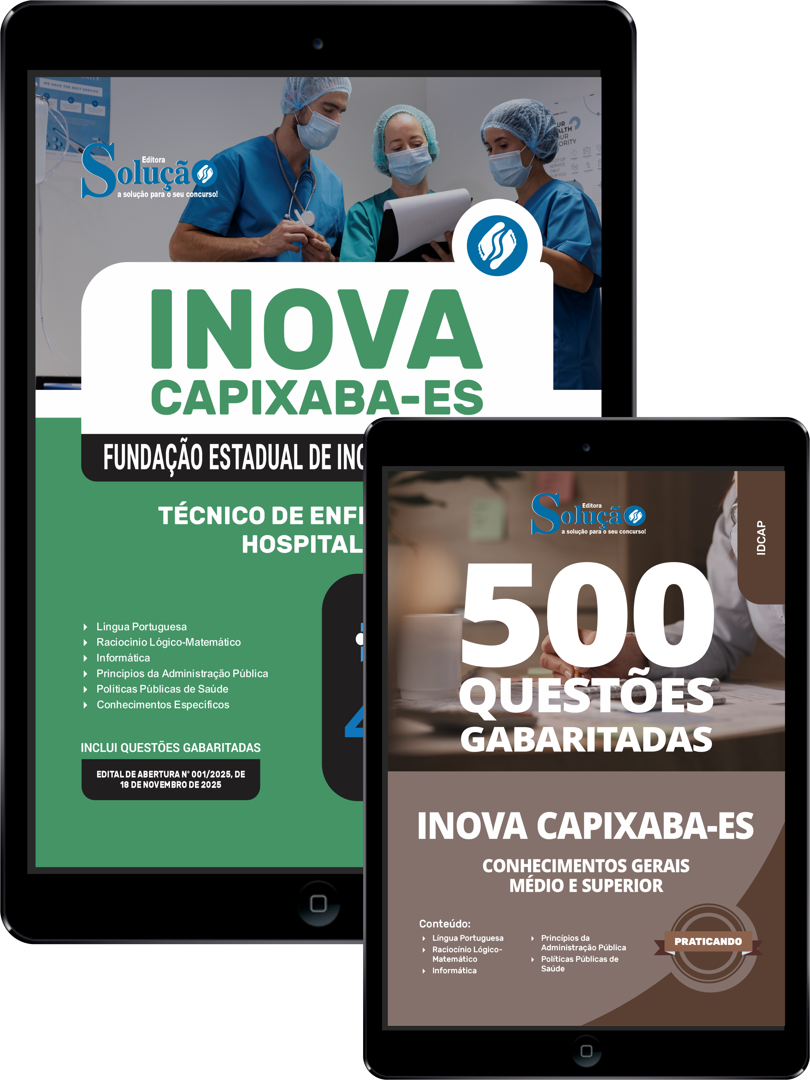 - Apostila INOVA Capixaba 2025 - Técnico de Enfermagem - Hospitalar: traz toda a teoria necessária de forma escrita e com exercícios; de acordo com o último edital e elaborado por nossa equipe de professores especializados em concursos.