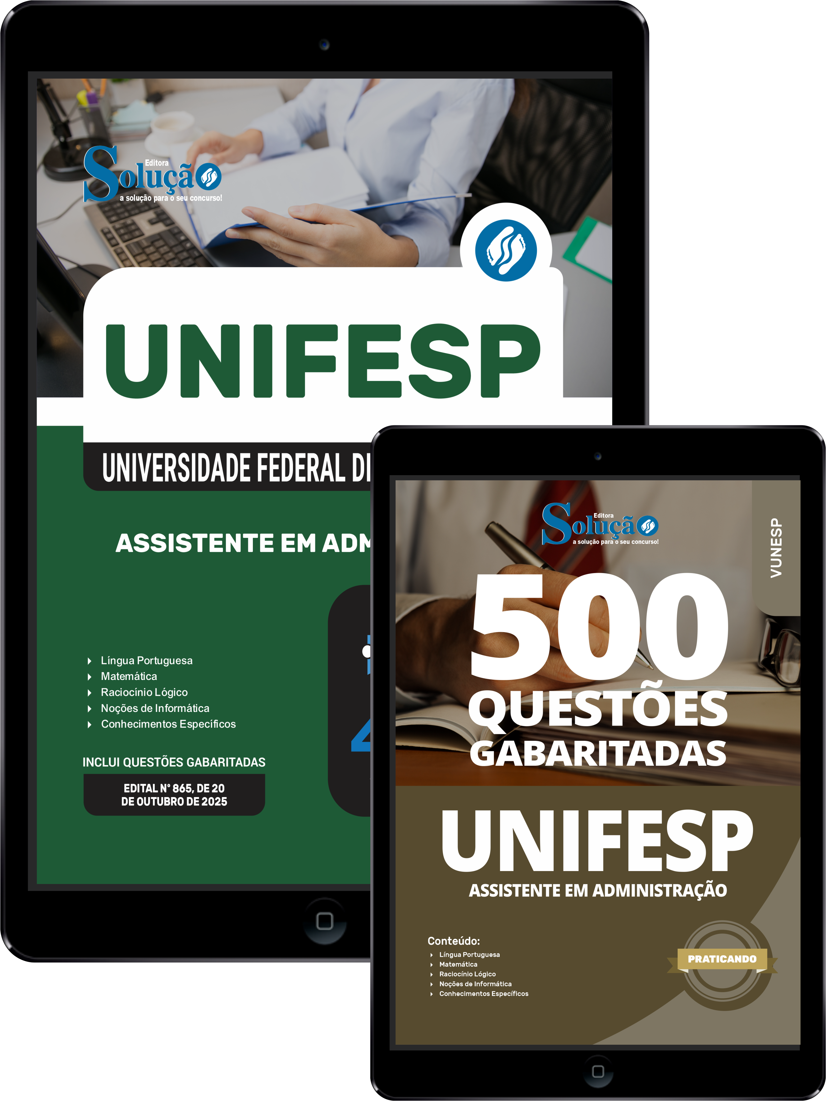 - Apostila UNIFESP 2025 - Assistente em Administração: traz toda a teoria necessária de forma escrita e com exercícios; de acordo com o último edital e elaborado por nossa equipe de professores especializados em concursos.