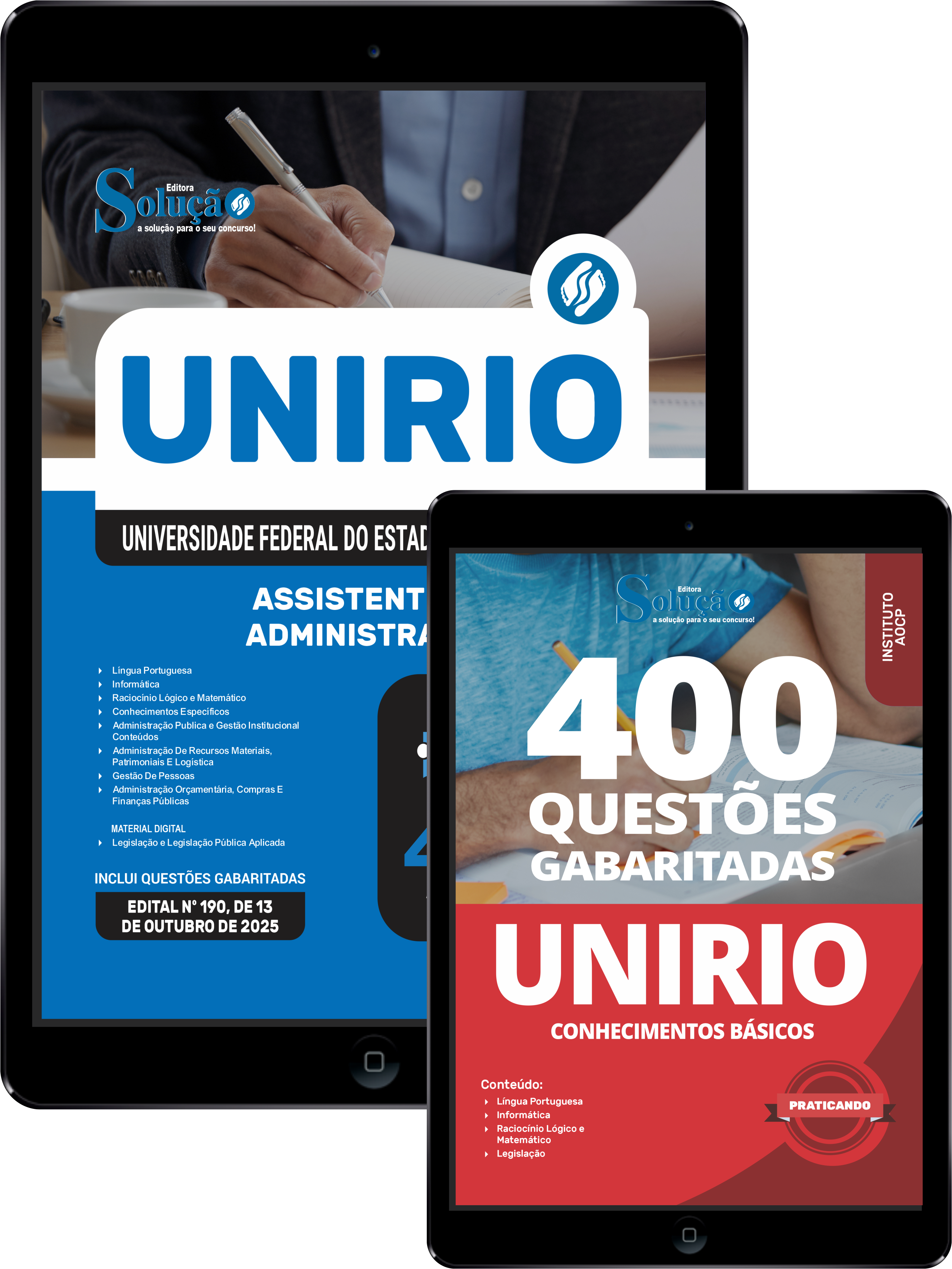 - Apostila UNIRIO 2025 - Assistente em Administração: traz toda a teoria necessária de forma escrita e com exercícios; de acordo com o último edital e elaborado por nossa equipe de professores especializados em concursos.