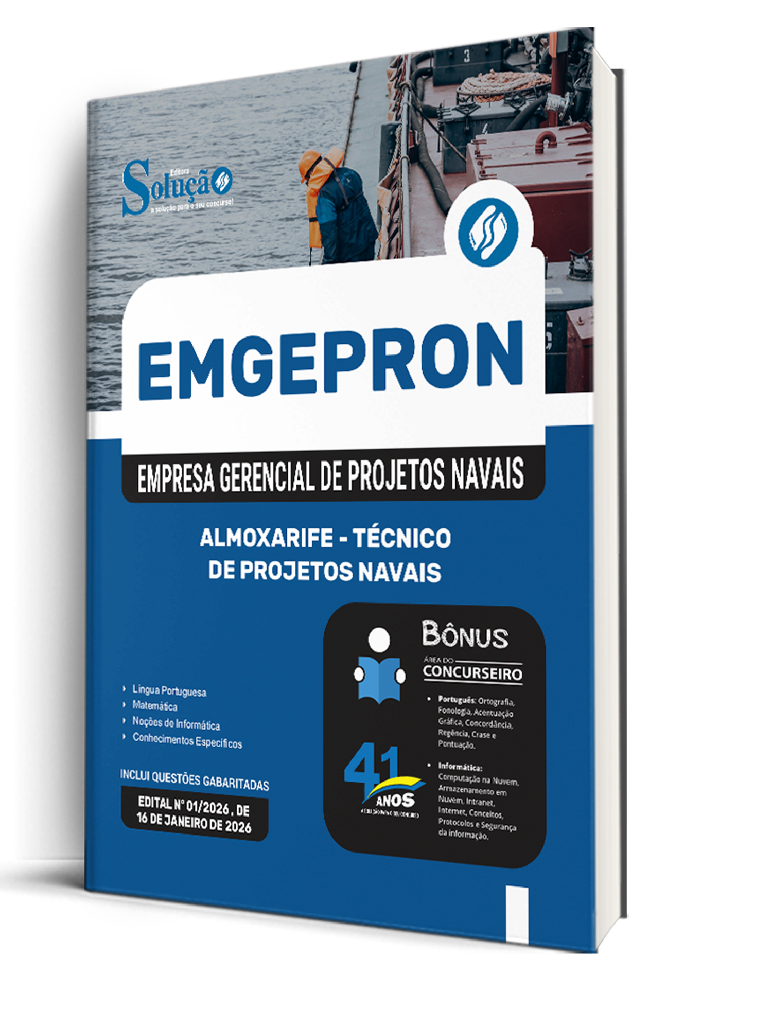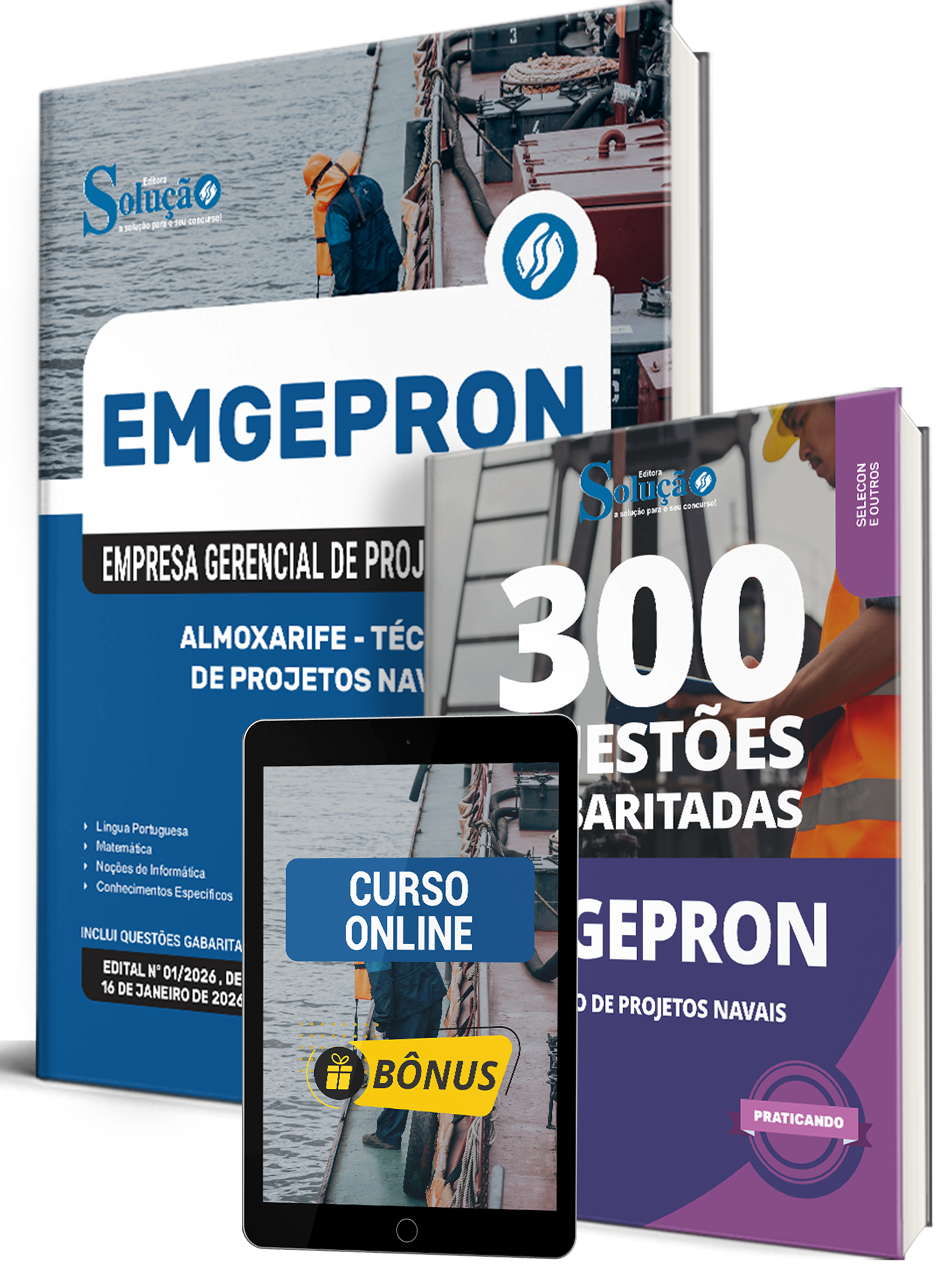 - Caderno de Questões EMGEPRON 2026 - Técnico de Projetos Navais - 300 Questões Gabaritadas: traz questões cuidadosamente selecionadas pela nossa equipe editorial, de acordo com o edital mais recente do concurso.