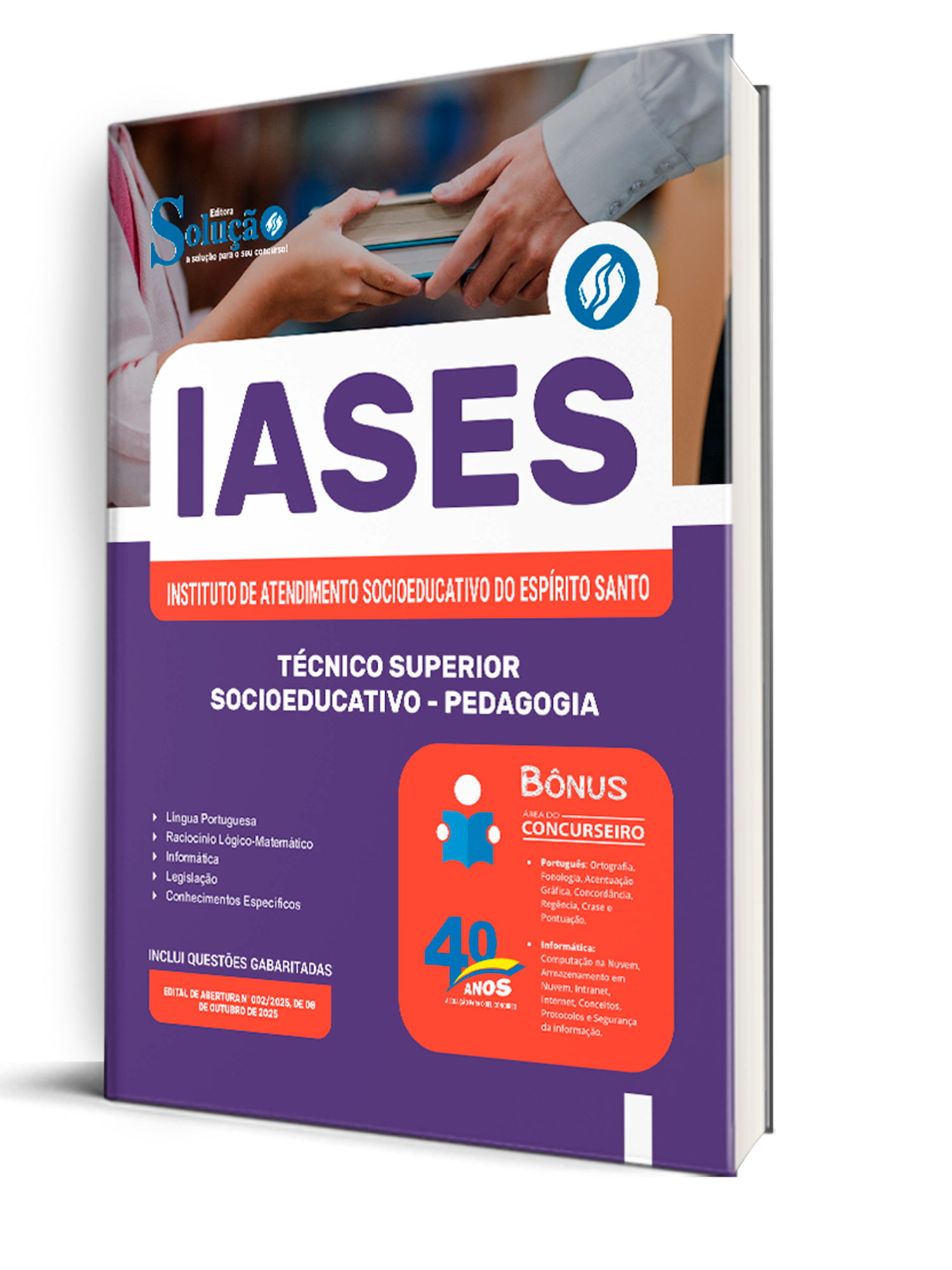 - Apostila IASES 2025 - Técnico Superior Socioeducativo - Pedagogia: traz toda a teoria necessária de forma escrita e com exercícios; de acordo com o último edital e elaborado por nossa equipe de professores especializados em concursos.