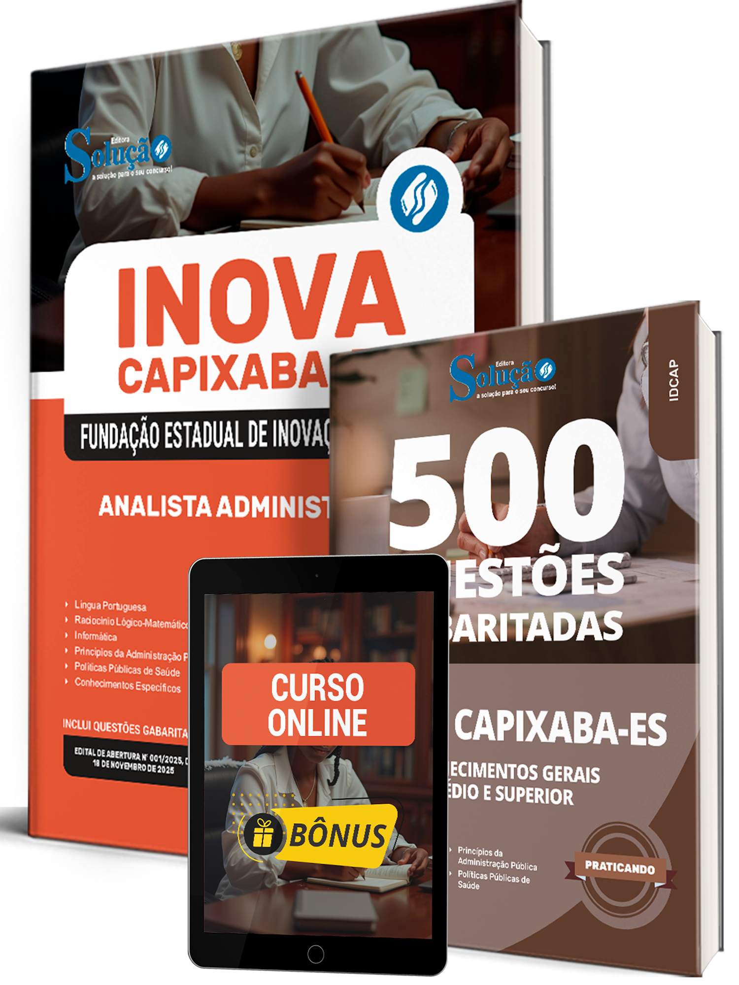 - Apostila INOVA Capixaba 2025 - Analista Administrativo: traz toda a teoria necessária de forma escrita e com exercícios; de acordo com o último edital e elaborado por nossa equipe de professores especializados em concursos.