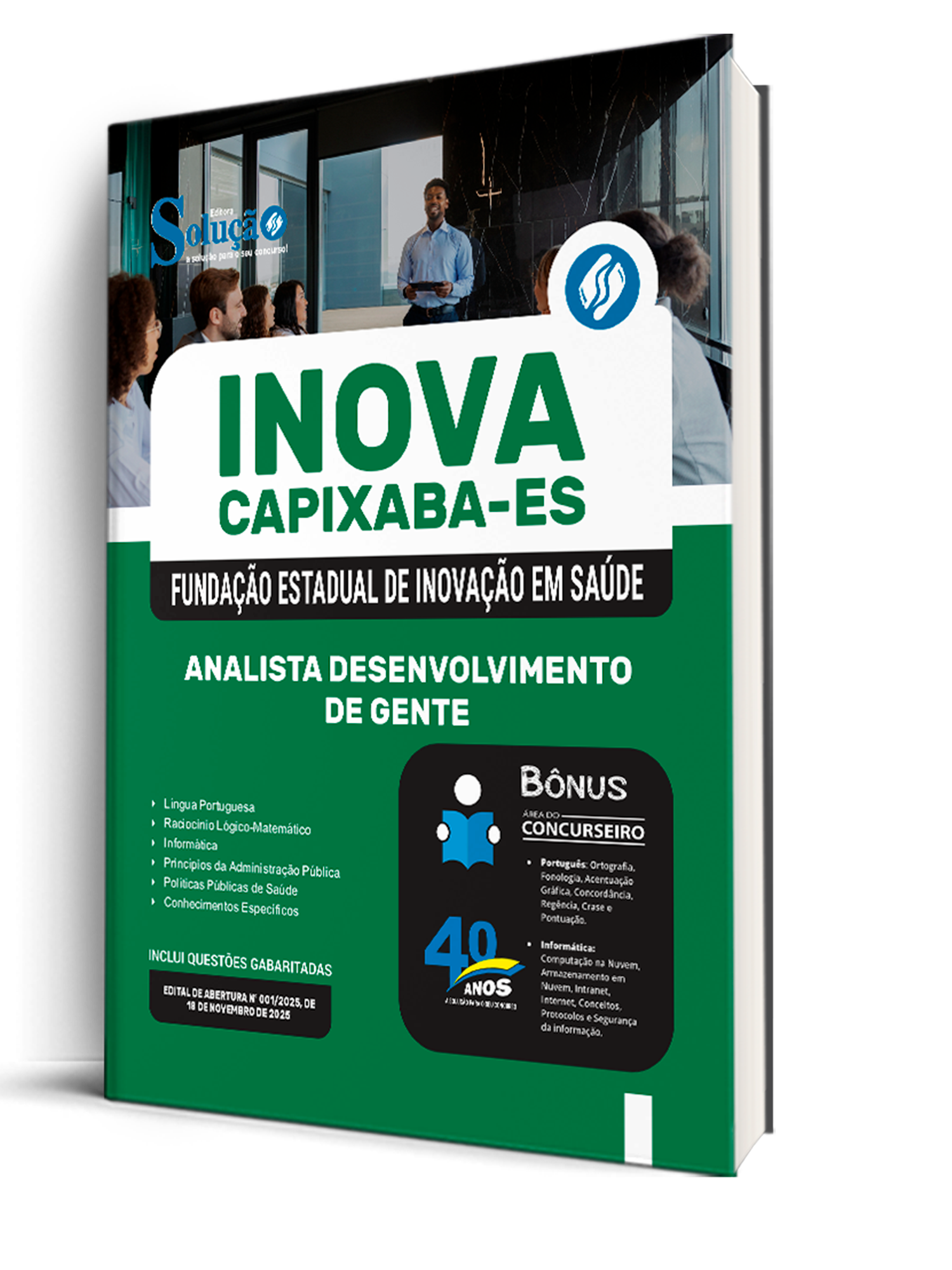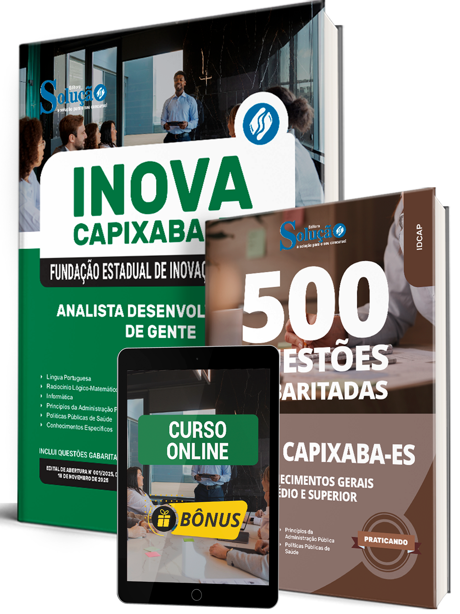 - Apostila INOVA Capixaba 2025 - Analista Desenvolvimento de Gente: traz toda a teoria necessária de forma escrita e com exercícios; de acordo com o último edital e elaborado por nossa equipe de professores especializados em concursos.