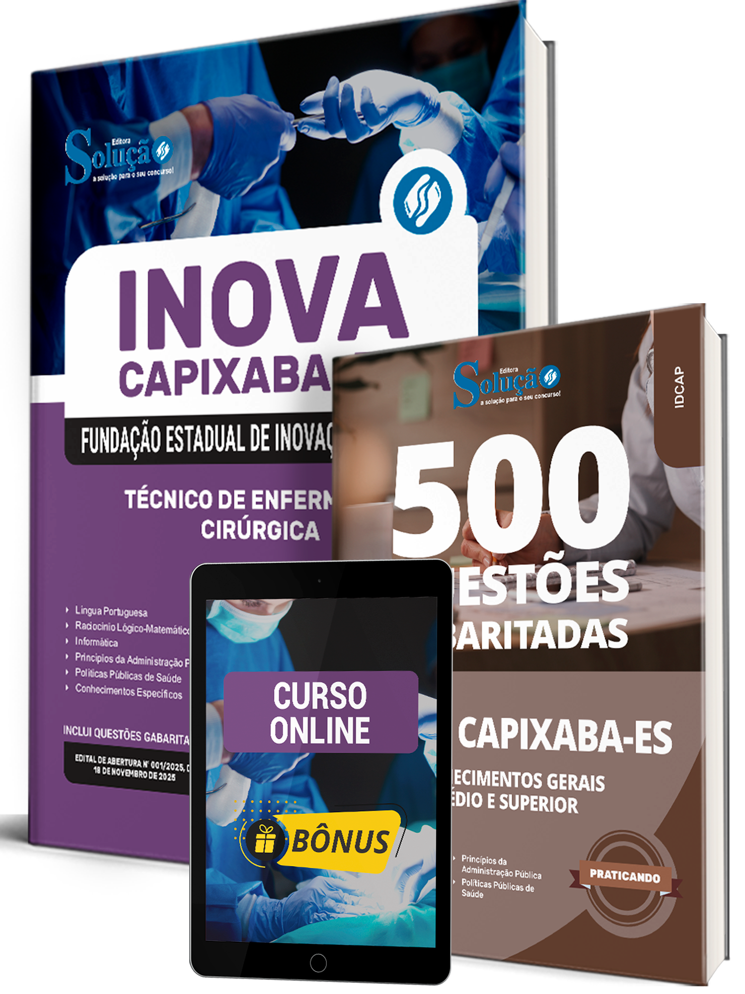 - Apostila INOVA Capixaba 2025 - Técnico de Enfermagem - Cirúrgica: traz toda a teoria necessária de forma escrita e com exercícios; de acordo com o último edital e elaborado por nossa equipe de professores especializados em concursos.