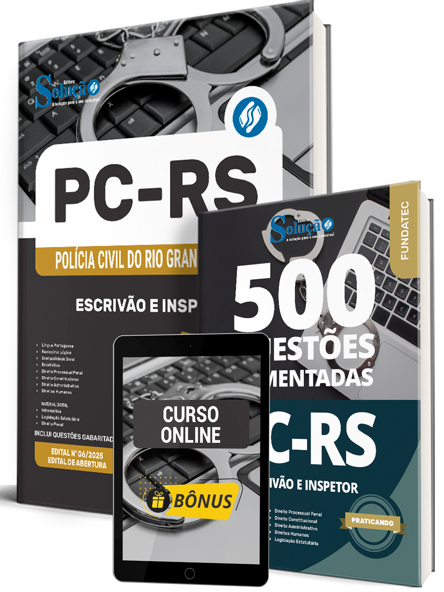 - Caderno de Questões PC-RS - Escrivão e Inspetor - 500 Questões Gabaritadas: traz questões cuidadosamente selecionadas pela nossa equipe editorial, de acordo com o edital mais recente do concurso.