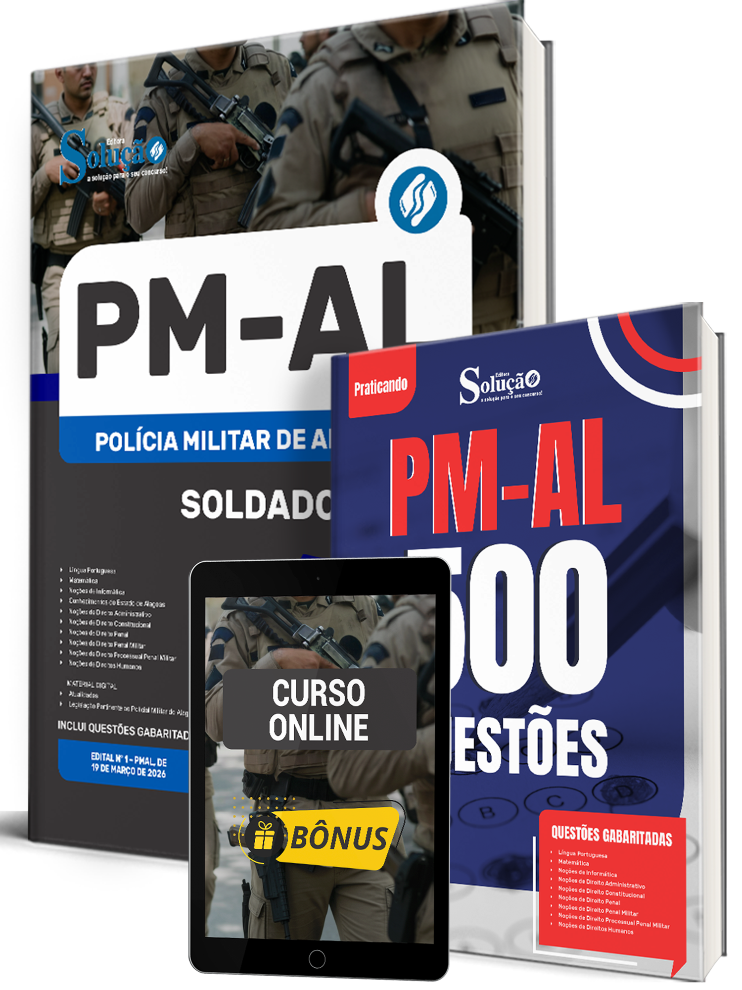 - Apostila PM-AL 2026 - Soldado: traz toda a teoria necessária de forma escrita e com exercícios; de acordo com o último edital e elaborado por nossa equipe de professores especializados em concursos.