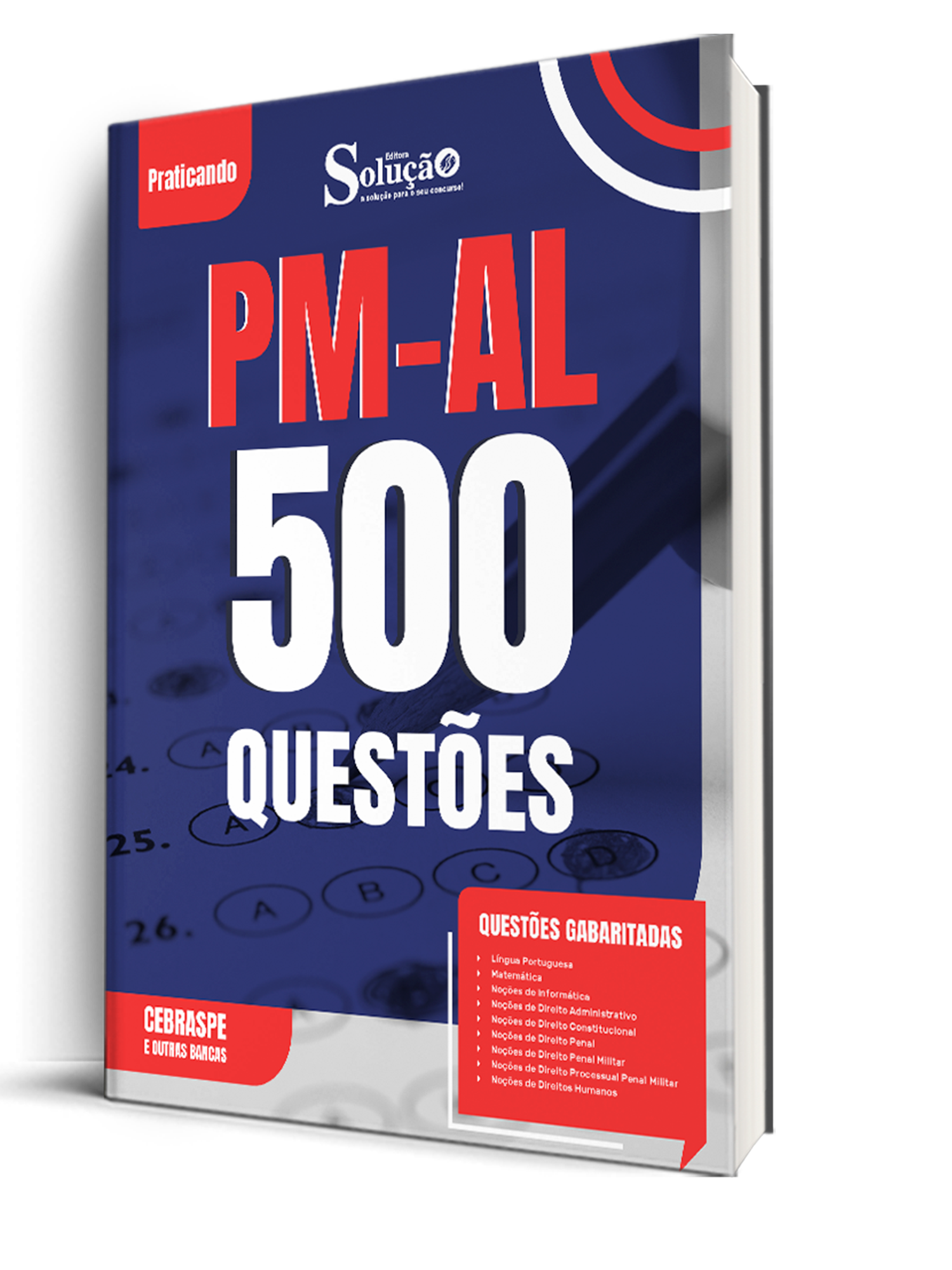 - Caderno de Questões PM-AL - Soldado - 500 Questões Gabaritadas: traz questões cuidadosamente selecionadas pela nossa equipe editorial, de acordo com o edital mais recente do concurso.